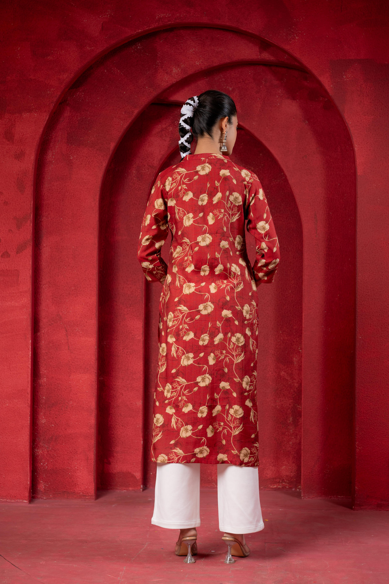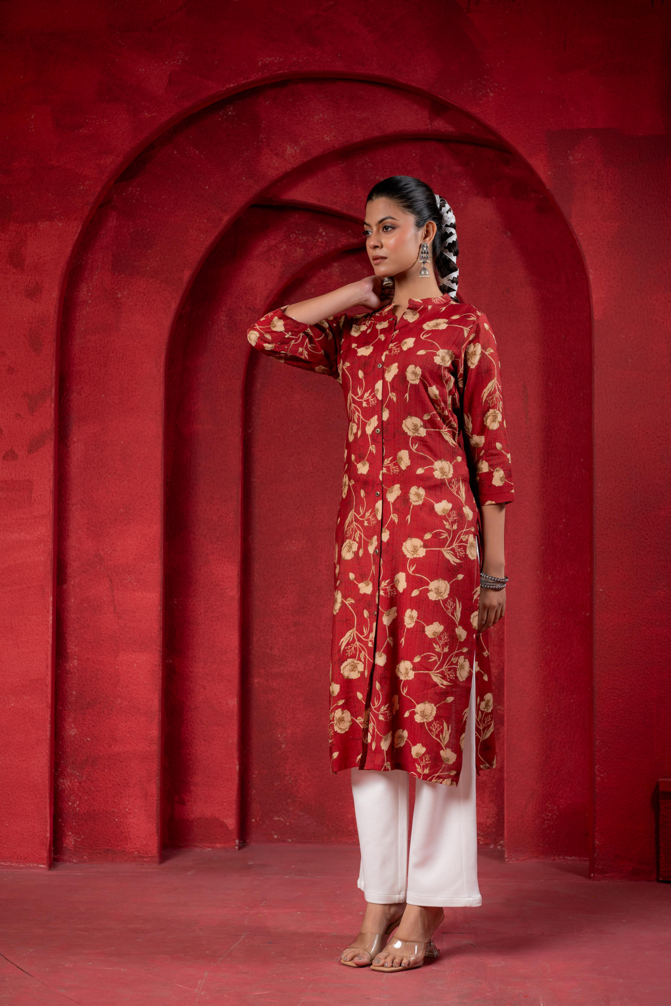 Elevate your everyday elegance with this maroon straight-fit kurta featuring an all-over botanical floral print. Designed with a clean band collar, button-down front, and 3/4th sleeves, this kurta blends comfort with timeless sophistication. The subtle palette and nature-inspired motifs make it perfect for casual outings, office wear, and festive day events. Pair it with white pants for a refined and contemporary look.Pack of Content :- 1 Kurta Top Type :- Kurta Top Pattern :- Printed Print Type :- Floral Top Fabric :- Viscose Top Design Styling :- Straight Kurta Top Hemline :- Straight Top Length :- Knee-length Top Shape :- Straight Neck :- Band collar Sleeve Length :- Three Quarter Sleeves Sleeve Styling :- Regular Occasion :- Casual Ornamentation :- Button Fit :- Straight