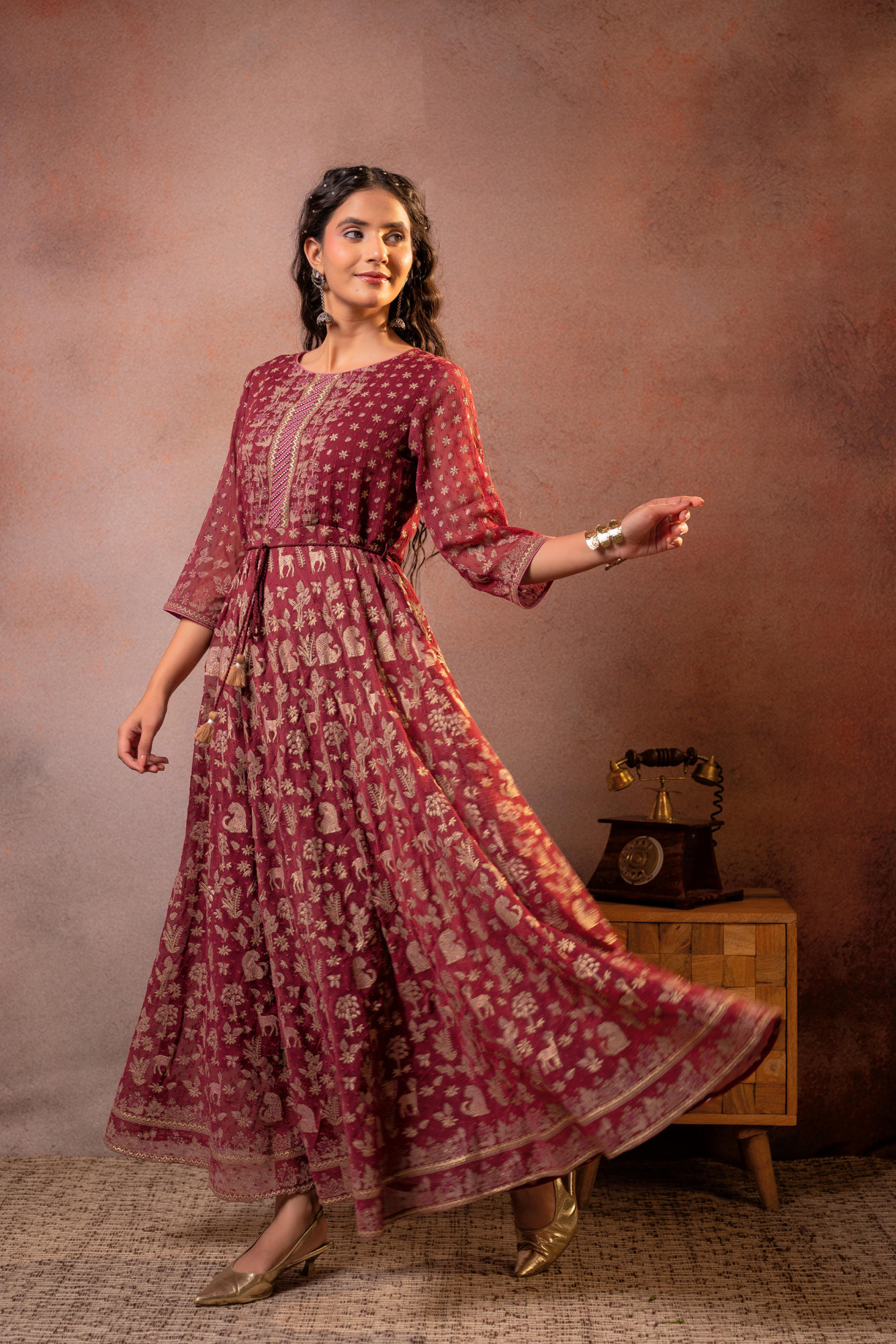 An elegant maroon Anarkali dress crafted with shimmering floral motifs and a graceful circular flare. Designed with a structured yoke panel, soft gathers, and delicate tassel detailing, this ensemble radiates timeless festive charm—perfect for wedding celebrations and refined evening occasions.