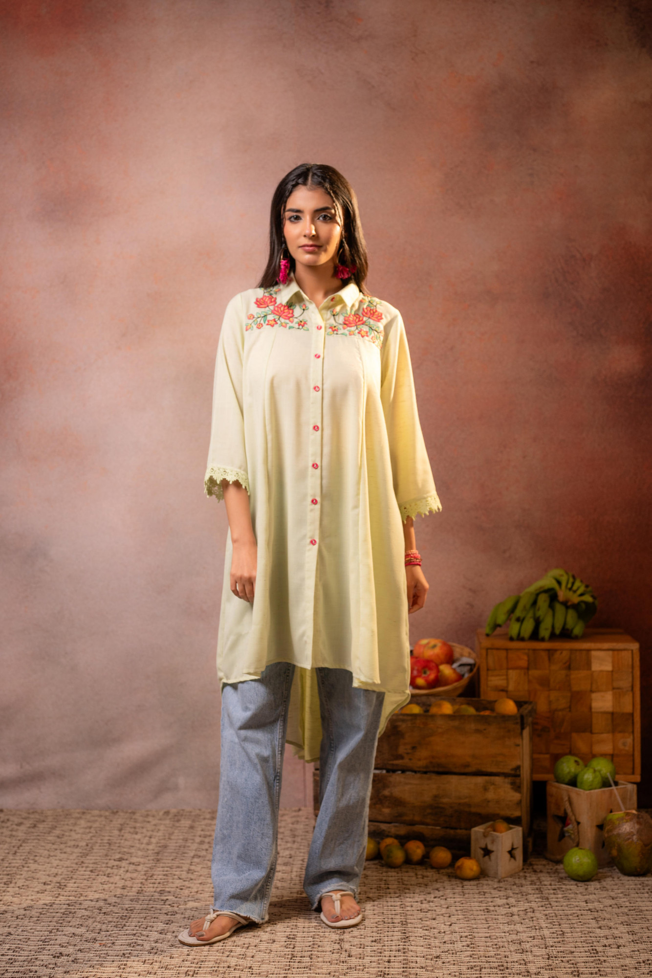 A relaxed shirt-style kurta in a soft pista green hue, elevated with delicate floral embroidery across the yoke. Designed with a high-low hemline and button-down front, this piece blends artisanal charm with contemporary comfort—perfect for effortless day dressing.