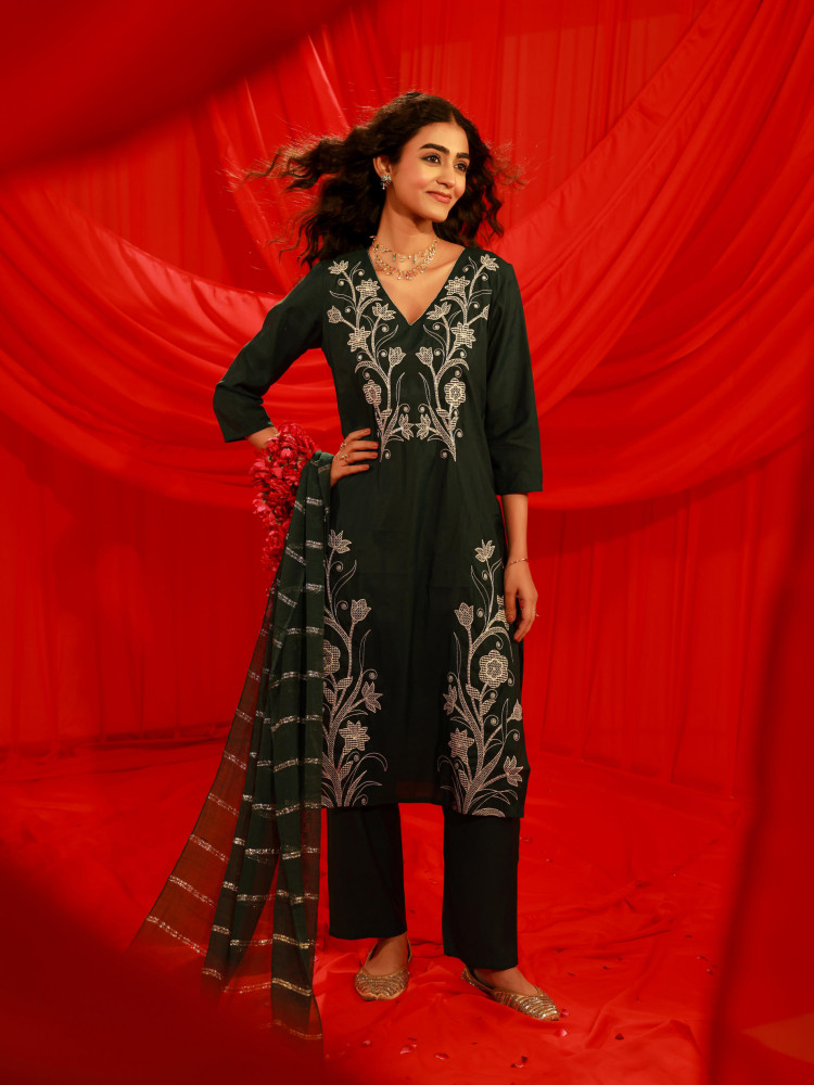 Make a statement this festive season with this mehandi green 3-piece set featuring a straight-fit calf-length kurta with V-neck, 3/4 sleeves, and side slits. Paired with solid ankle-length pants and matching dupatta, crafted in poly viscose with beautiful thread work.Each Size Pack of Content :- 1 Kurta, 1 Pant, 1 Dupatta Top Type :- Kurta Dupatta(Yes, No) :- Yes Top Pattern :- Embroidered Print Type :- Solid Top Fabric :- Viscose Top Design Styling :- Straight Top Hemline :- Straight Top Length :- Calf Length Top Shape :- Straight Neck :- V-Neck Sleeve Length :- 3/4 Sleeve Sleeve Styling :- Regular Sleeve Top Closure :- slip on Bottom Type :- Pants Bottom Fabric :- Viscose Bottom Pattern :- Solid Bottom Closure :- slip on Waistband :- Parsley Waistband Occasion :- festive Ornamentation :- Thread Work Dupatta Fabric :- Viscose Dupatta Pattern :- Solid Fit :- Regular Fit