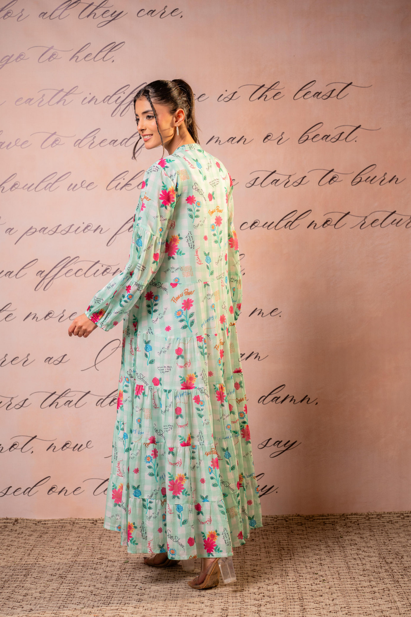 A soft and feminine mint green maxi dress adorned with vibrant floral prints . Designed with gathered tiers and voluminous sleeves, this flowy silhouette exudes effortless elegance and romantic charm—perfect for summer brunches, vacations, and daytime celebrations.Pack of Content :- 1 LONGDRESSTop Type :- Dress Top Pattern :- Printed Print Type :- Floral Top Fabric :- Cotton Top Design Styling :- Tiered maxi dress with gathered panels Top Hemline :- Flared Top Length :- Ankle length Top Shape :- A-line Neck :- Mandarin collar with slit Sleeve Length :- Full Top Closure :- Front button-down >Ornamentation :- Buttons