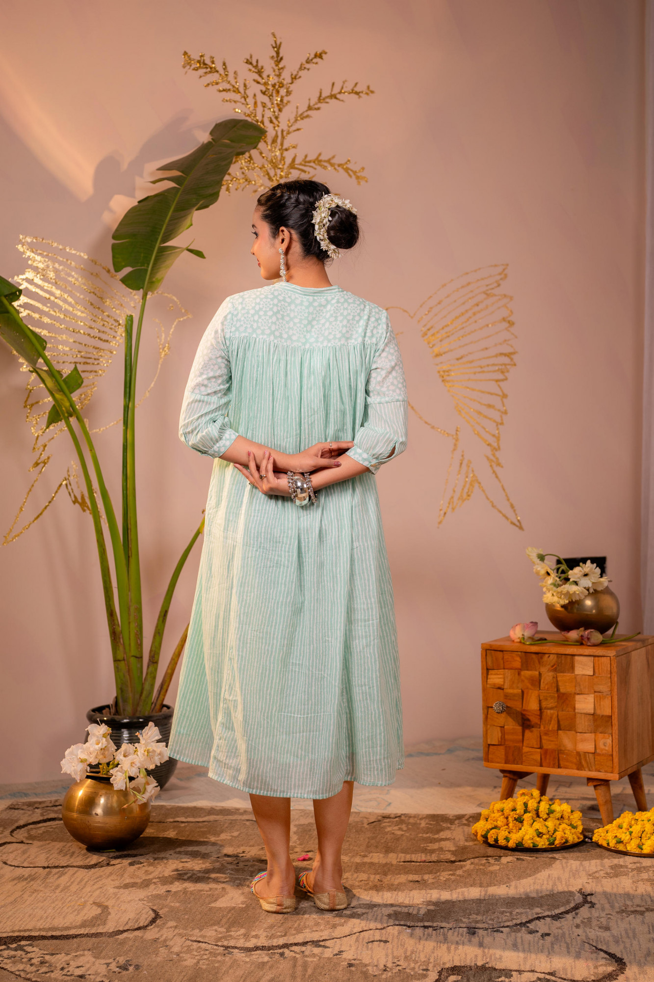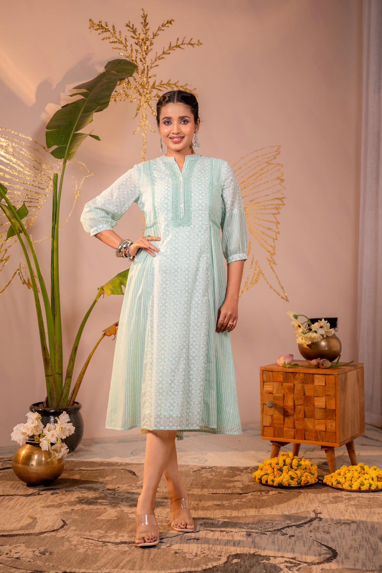 A refreshing mint kurta set designed with a harmonious mix of delicate floral buti prints and vertical stripe panels. The straight silhouette is elevated with a detailed printed yoke and soft gathers for fluid movement. Paired with coordinated striped straight pants, this ensemble blends subtle tradition with modern relaxed elegance—perfect for refined daytime styling.