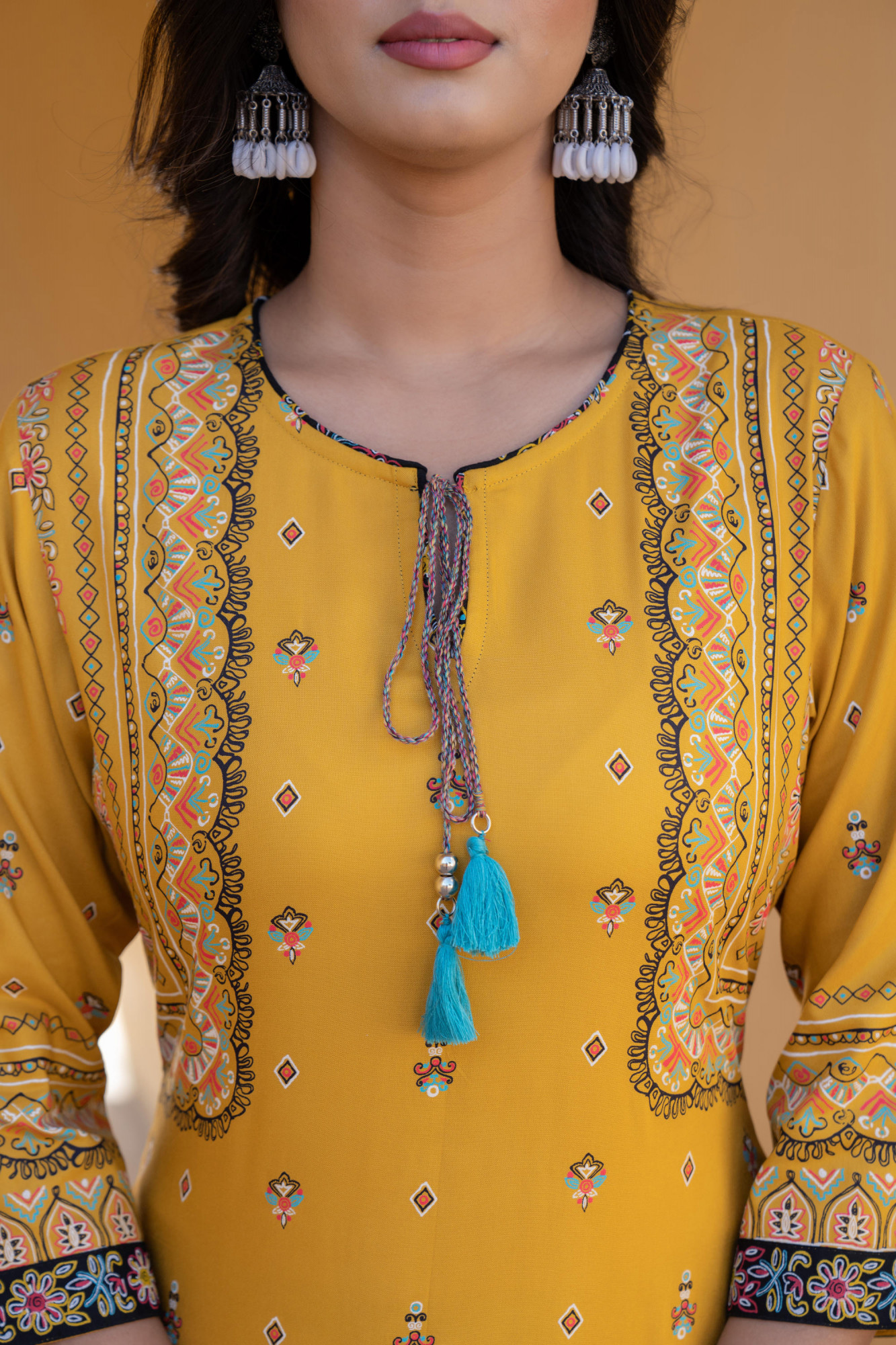 Mustard Ethnic Motif Printed Viscose Kurta Pant And Dupatta Set featuring doris and tassels for a stylish touch. The knee-length kurta has a straight silhouette and a graceful keyhole neckline, paired with three-quarter regular sleeves for a comfortable fit. Accompanied by printed slip-on pants and a printed dupatta,Pack of Content :- 1 Kurta, 1 Pant, 1 DupattaTop Type :- Kurta Dupatta(Yes, No) :- Yes Top Pattern :- Printed Print Type :- Ethnic Motif Top Fabric :- Viscose Top Design Styling :- Straight Top Hemline :- Straight Top Length :- Knee Length Top Shape :- Straight Neck :- Key Hole Neckline Sleeve Length :- Three Quarter Sleeves Top Closure :- Slip-On Bottom Fabric :- Viscose Bottom Type :- Pants Bottom Pattern :- Printed Waistband :- Partially Elasticated Occasion :- Casual Ornamentation :- Doris, tassels Dupatta Fabric :- Poly Chiffon Dupatta Pattern :- Printed Number of Pockets :- 1 Fit :- Straight Length in Inch :- 46