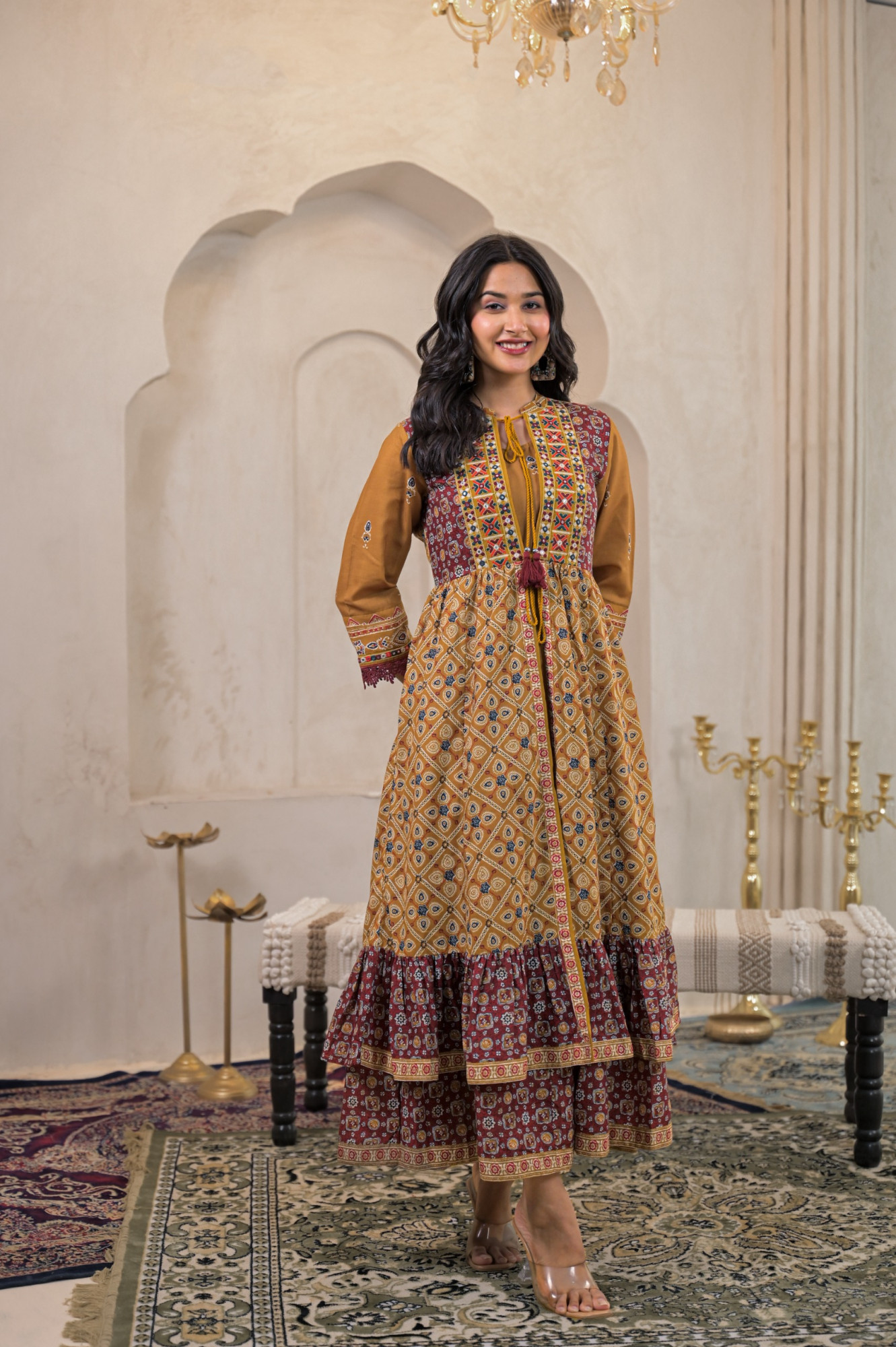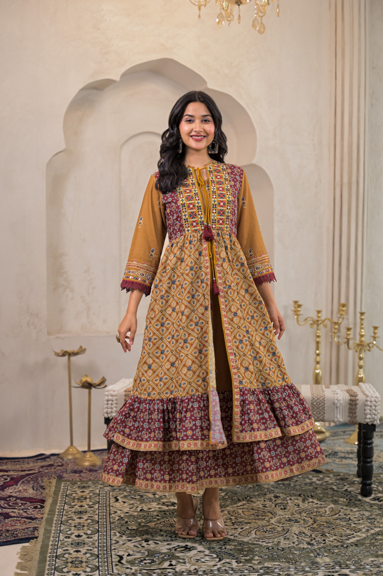 Stand out in this mustard double-layered longdress made from soft manmade fiber. Features ethnic motifs, round neck, 3/4 sleeves, and a front slit. Comes with a matching inner and is detailed with mirror work, thread work, dori ties, and tassels.Each Size of Content :- 1 Longdress, 1 Inner Top Type :- Dress Top Pattern :- Embroidered Print Type :- Ethnic Motifs Top Fabric :- Manmade Fiber Top Design Styling :- Double Layered Top Hemline :- Flared Top Length :- Ankle Length Top Shape :- Fit & Flared Neck :- Round Neck Sleeve Length :- 3/4 Sleeve Sleeve Styling :- Regular Sleeve Top Closure :- Dori Ornamentation :- Mirror Work, Thread Work, Dori, Tassels Fit :- Regular Fit