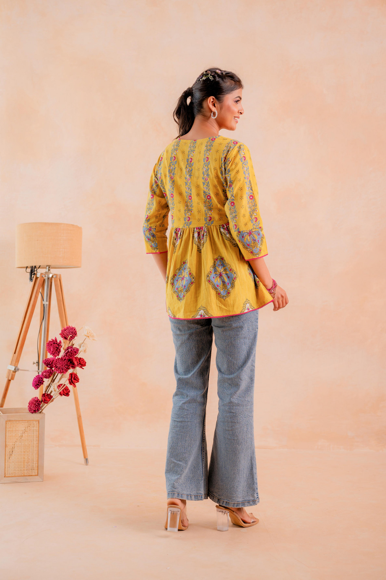 This vibrant mustard ethnic tunic showcases traditional floral and geometric motifs in an all-over print. Designed with a gathered waist and flared silhouette, it offers a graceful fall and comfortable wear. The round neckline with a button placket adds classic charm, making it perfect for everyday ethnic styling and casual festive occasions.Pack of Content Each Size Set:- 1 TUNIC Top Type :- Tunic Top Pattern :- Printed Print Type :- Floral Top Fabric :- Cotton Top Design Styling :- A-line Short Kurta Top Hemline :- Flared Top Length :- Mid-thigh length Top Shape :- A-line Neck :- Round neck Sleeve Length :- Three-quarter sleeves Sleeve Styling :- Regular Top Closure :- Button placket (front) Occasion :- Casual Ornamentation :- Buttons