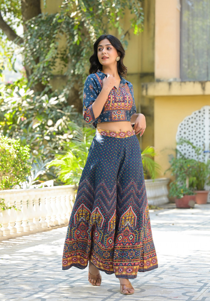 Navy blue geometric printed Liva Rayon top and palazzo set embellished with sequins and coins. The top features a waist-length straight silhouette, shirt collar, and three-quarter regular sleeves, paired with printed slip-on palazzo pants, offering both elegance and comfort for any occasion