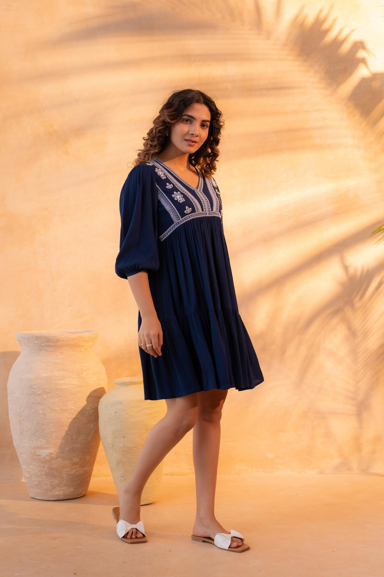A flowy navy boho-inspired dress featuring intricate offwhite & ivory embroidery on the yoke. Designed with a relaxed silhouette and soft gathers, this piece blends comfort with understated elegance. Perfect for sunlit brunches, resort escapes, or casual festive moments, it embodies effortless movement and artisanal charm.Pack of Content :- 1 SHORTDRESSTop Type :- Dress Top Pattern :- Embroidered Print Type :- Bohemian Top Fabric :- Viscose Top Design Styling :- Empire yoke with gathered flare Top Hemline :- Flared Top Length :- Above Knee Top Shape :- A-line Neck :- V-neck Sleeve Length :- Three-quarter sleeves Top Closure :- Slip-on