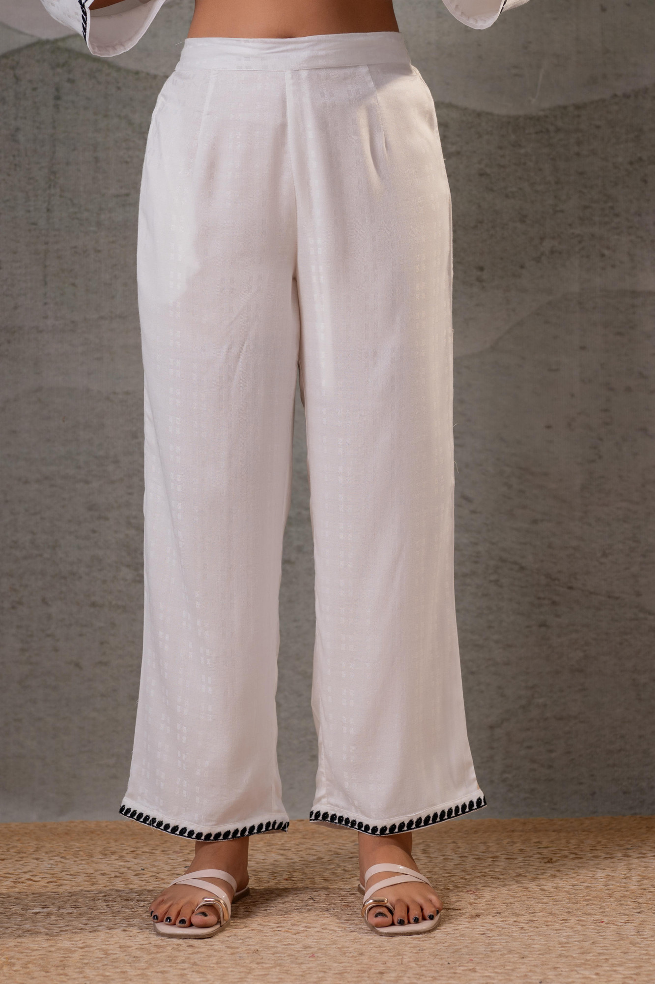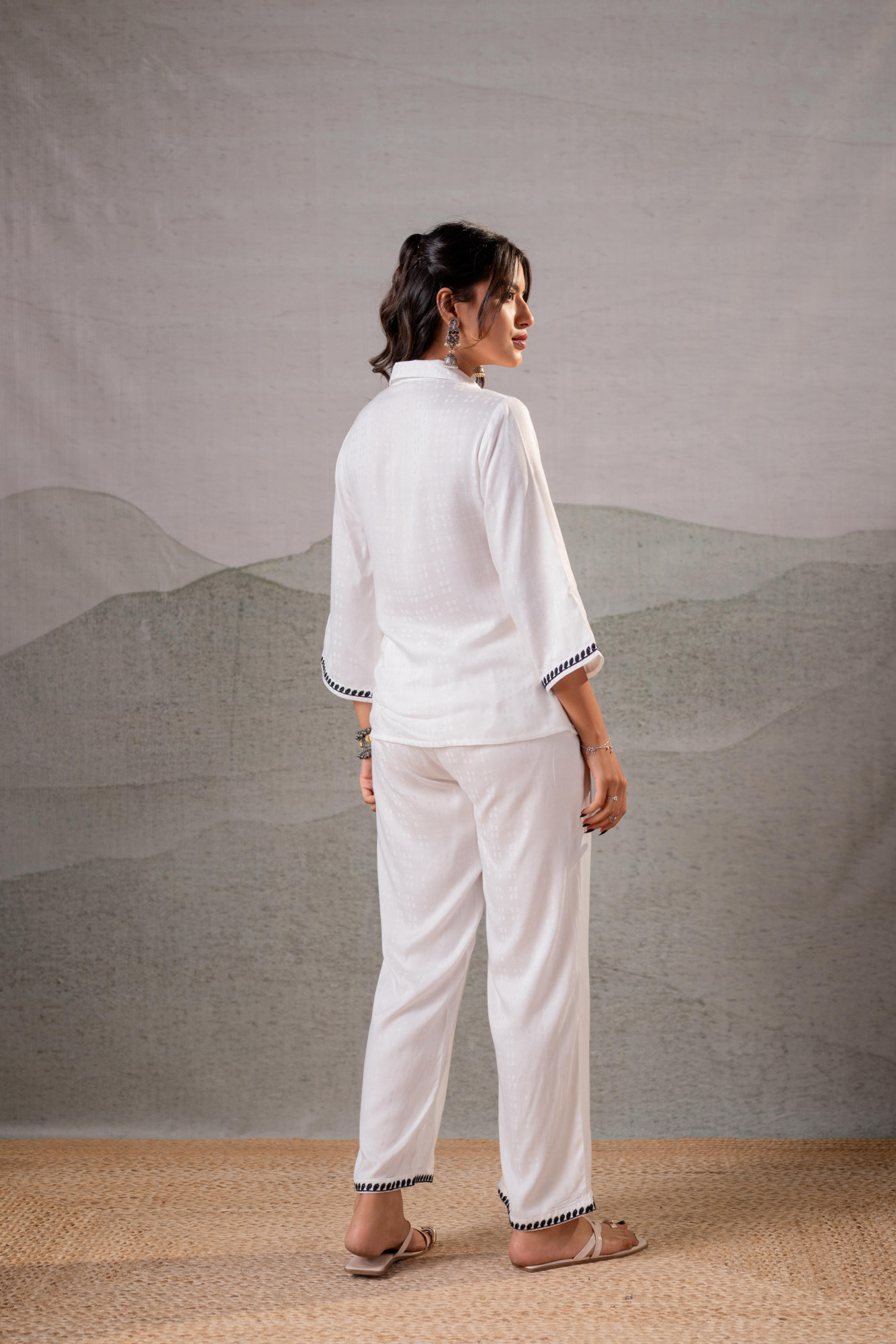 An elegant white co-ord set highlighted with bold black floral embroidery, designed for effortless sophistication. Featuring a straight embroidered kurta-style top with contrast borders and relaxed straight pants, this ensemble blends artisanal charm with modern comfort—perfect for day-to-evening wear.Top Type :- Shirt Dupatta(Yes, No) :- No Top Pattern :- Embroidered Print Type :- Floral Top Fabric :- Viscose Top Design Styling :- Straight Relaxed Shirt Top Hemline :- Straight Top Length :- Hip length Top Shape :- Straight Neck :- Shirt collar Sleeve Length :- Three-quarter sleeves Sleeve Styling :- Wide bell sleeves Bottom Type :- Pant Bottom Fabric :- Viscose Bottom Pattern :- Solid Ornamentation :- Buttons,Threads