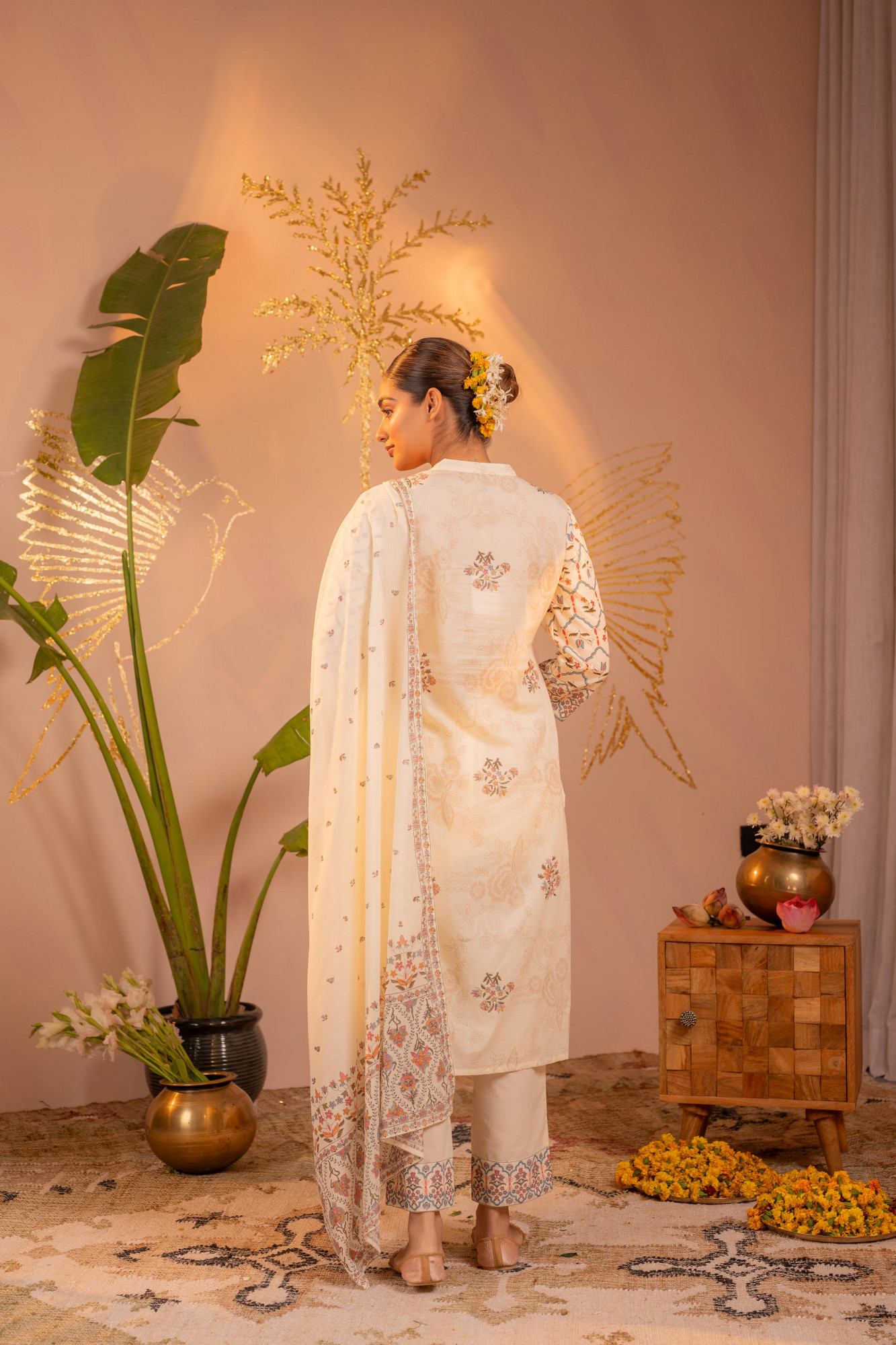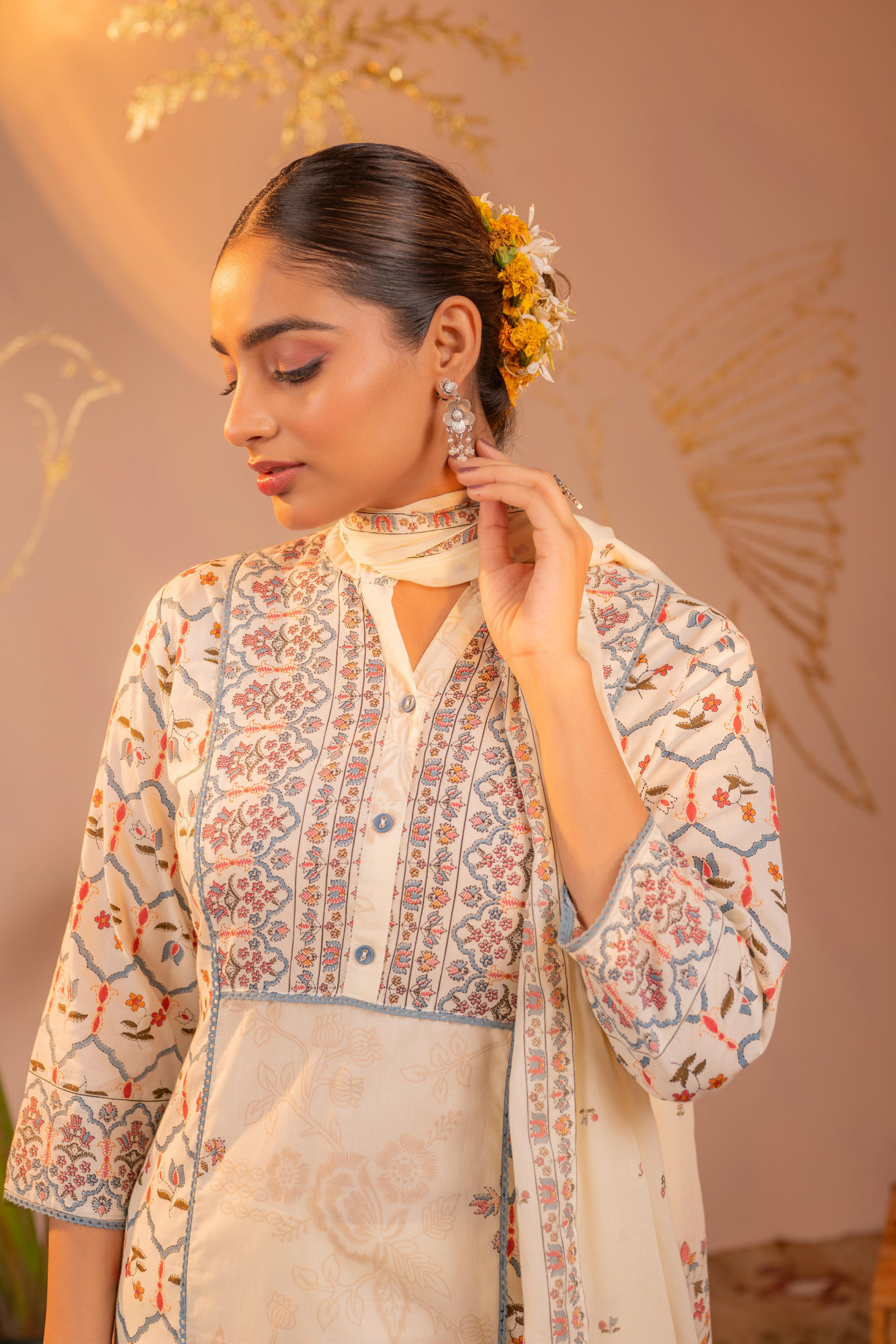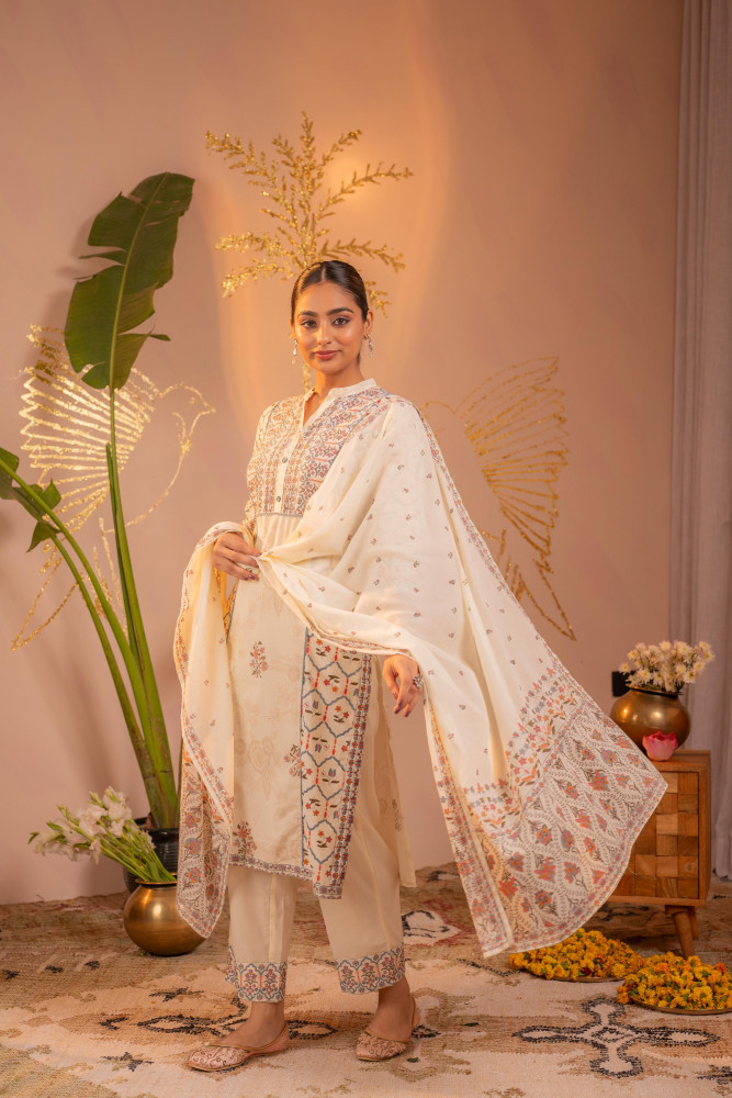 Bold and festive, this Off-White straight kurta set showcases intricate Ajrakh-inspired geometric and floral motifs in orange and blue tones. The structured straight silhouette is enhanced with detailed yoke and border prints, giving it a refined ethnic appeal. Paired with coordinated straight pants featuring printed hem detailing and a matching dupatta adorned with delicate motifs and border accents, this ensemble is perfect for celebratory occasions and traditional gatherings.Top Type :- Kurta Dupatta(Yes, No) :- Yes Top Pattern :- Printed Print Type :- Ajrakh Top Fabric :- Cotton Top Design Styling :- Straight Kurta Top Hemline :- Straight Top Length :- Knee Length Top Shape :- Straight Neck :- Round neck with V-notch Sleeve Length :- Three-quarter sleeves Top Closure :- Slip-on Bottom Type :- Pant Bottom Fabric :- Cotton Bottom Pattern :- Solid Ornamentation :- Buttons,Lace Dupatta Fabric :- Cotton