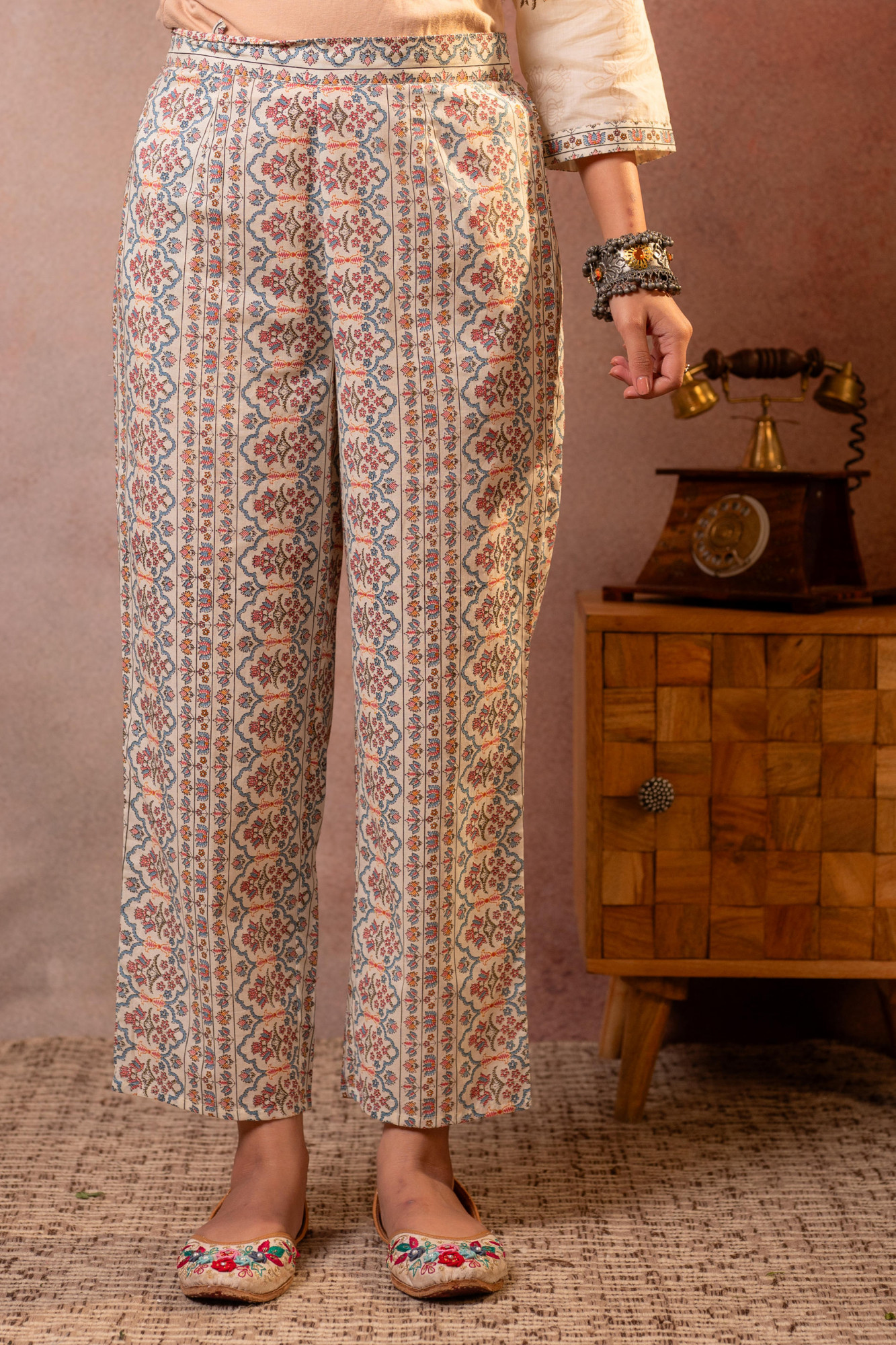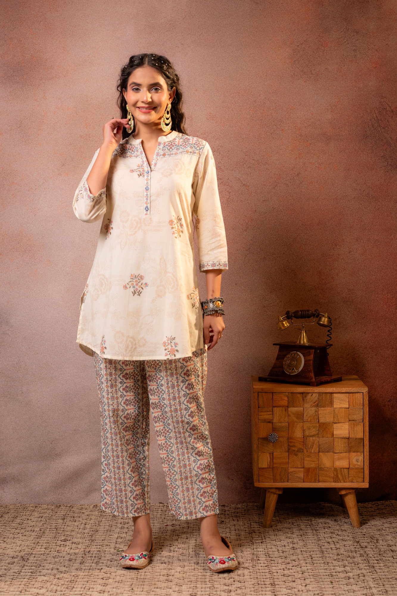 An elegant off-white co-ord set featuring delicate floral and paisley-inspired prints. Paired with coordinated printed straight pants, this ensemble reflects timeless Indian aesthetics blended with everyday comfort—perfect for graceful daytime dressing.Pack of Content Each Size Set:- 1 TUNIC, 1 PANT Top Type :- Tunic Top Pattern :- Printed Print Type :- Floral Top Fabric :- Cotton Top Design Styling :- Straight Short Kurta Top Hemline :- Straight Top Length :- Hip length Top Shape :- Straight Neck :- Split V-neck Sleeve Length :- Three-quarter sleeves Sleeve Styling :- Regular Top Closure :- Slip-on Bottom Type :- Pant Bottom Fabric :- Cotton Bottom Pattern :- Printed Waistband :- Partially elasticated Occasion :- Casual Ornamentation :- NA