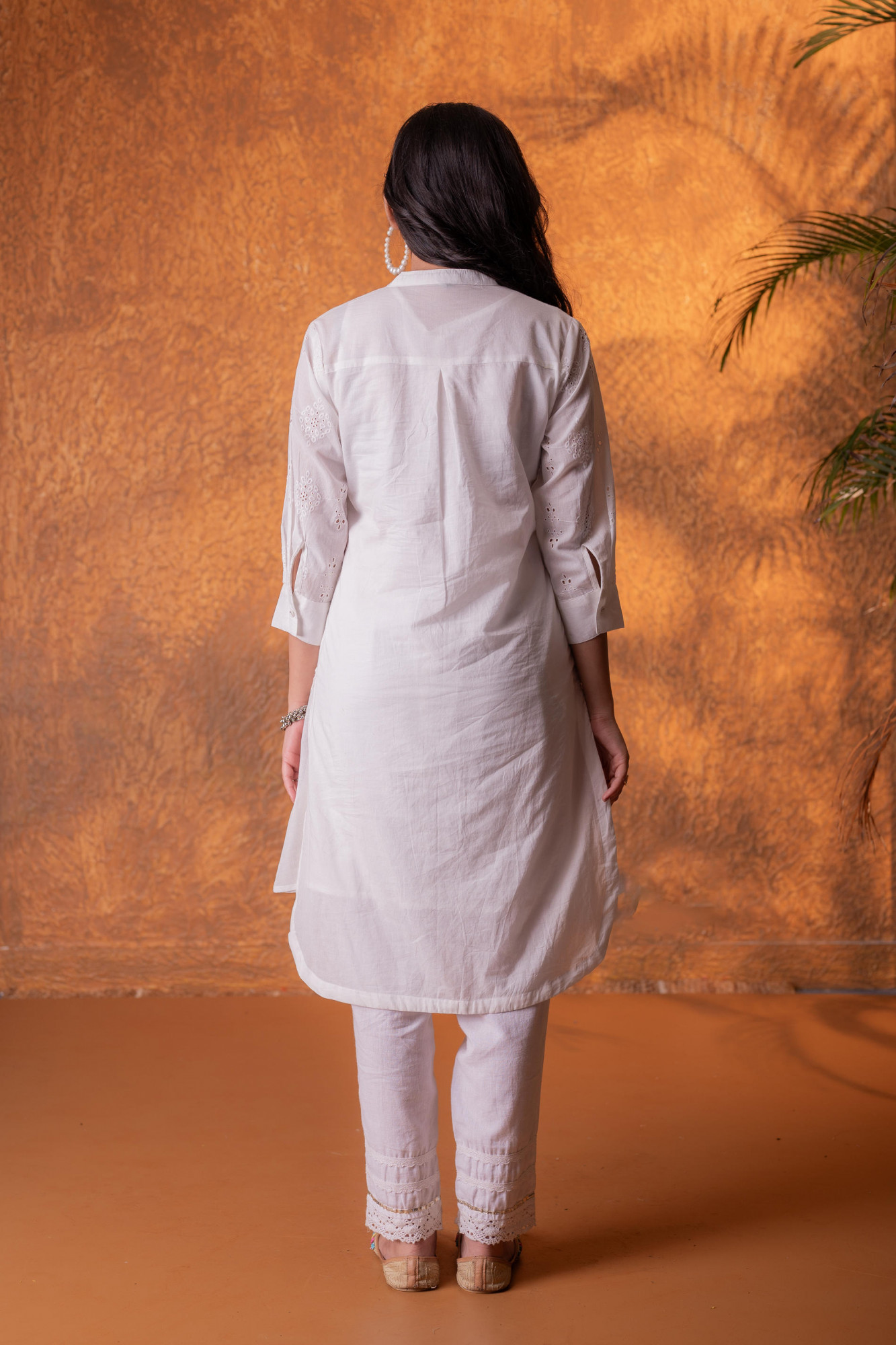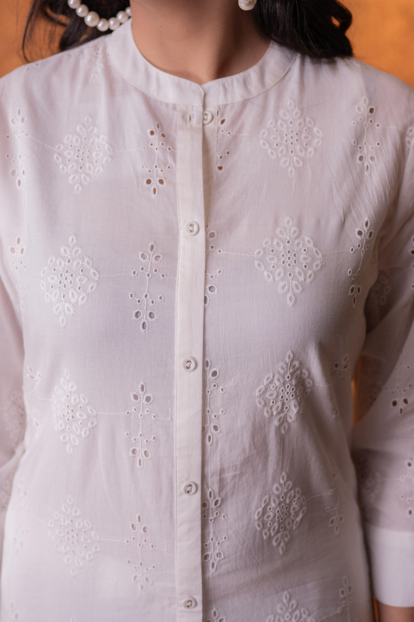 A refined off-white kurta crafted with delicate all-over chikankari-inspired embroidery. Designed in a straight silhouette with a button-down front, this kurta balances minimal elegance with handcrafted finesse, perfect for everyday ethnic styling.Pack of Content Each Size Set:- 1 KURTA Top Type :- Kurta Top Pattern :- Embroidered Print Type :- Chikankari Top Fabric :- Cotton Top Design Styling :- Straight Kurta Top Hemline :- Straight with soft rounded edges Top Length :- Knee length Top Shape :- Straight Neck :- Round neckline with short stand collar Sleeve Length :- Three-quarter sleeves Sleeve Styling :- Regular Top Closure :- Full front button-down placket Occasion :- Casual Ornamentation :- Buttons
