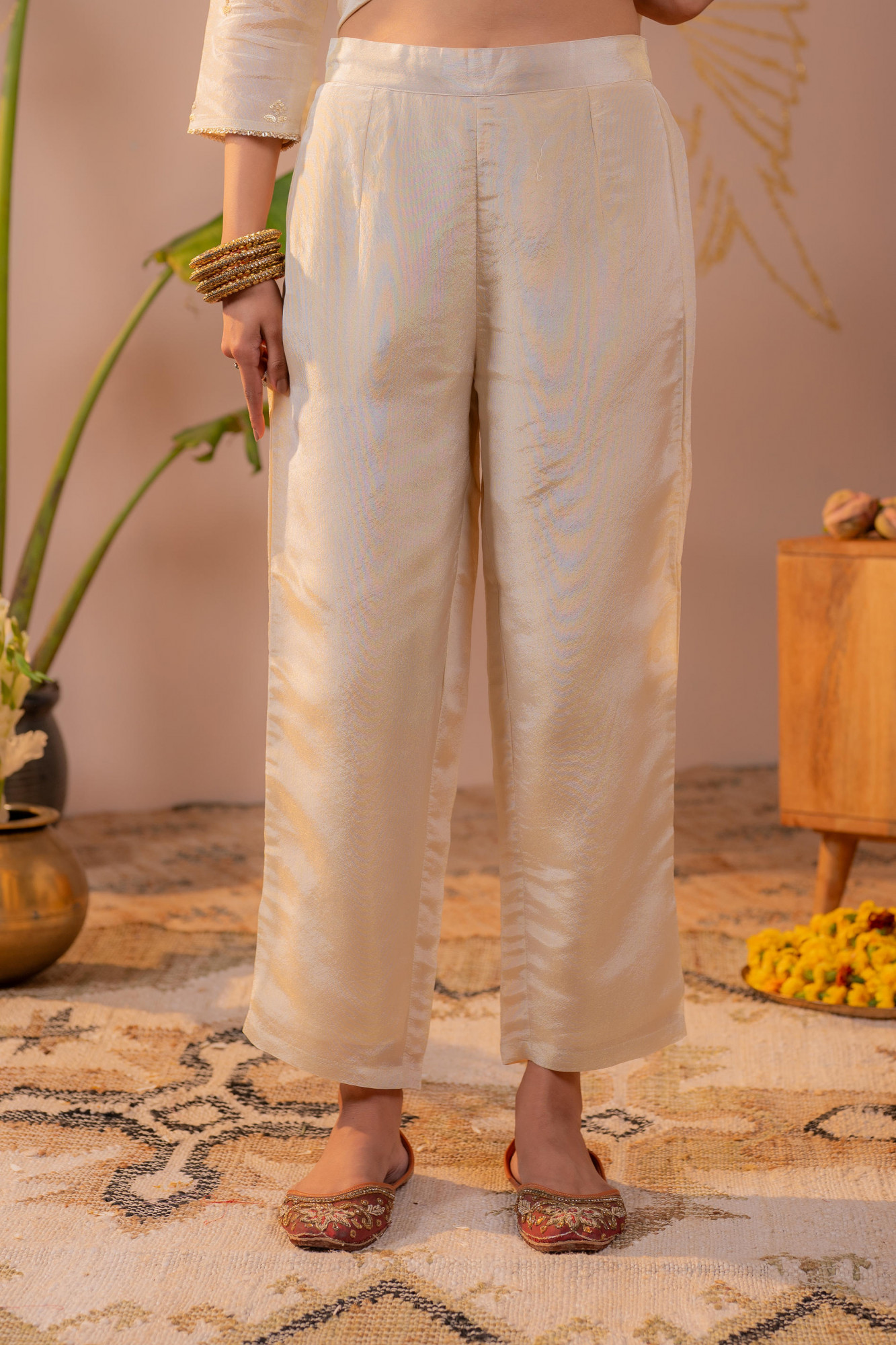 Vibrant and festive, this off-white kurta set is beautifully accented with delicate gold buti motifs that add a subtle festive shimmer. Designed in a straight silhouette with a flattering V-neckline, the kurta pairs seamlessly with matching straight pants. The highlight of the ensemble is the rich maroon dupatta adorned with gold polka butis and an intricately woven zari border, making it perfect for celebrations, traditional gatherings, and evening festivities.Top Type :- Kurta Dupatta(Yes, No) :- Yes Top Pattern :- Embroidered Print Type :- Zari Top Fabric :- Viscose Top Design Styling :- Straight Kurta Top Hemline :- Straight Top Length :- Knee Length Top Shape :- Straight Neck :- V-neck Sleeve Length :- Three-quarter sleeves Top Closure :- Slip-on Bottom Type :- Pant Bottom Fabric :- Viscose Bottom Pattern :- Solid Ornamentation :- Zari threads Dupatta Fabric :- Viscose