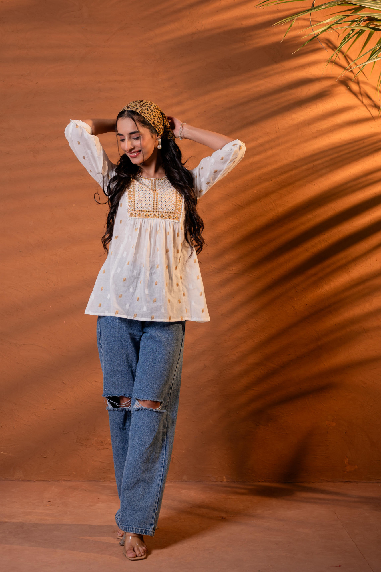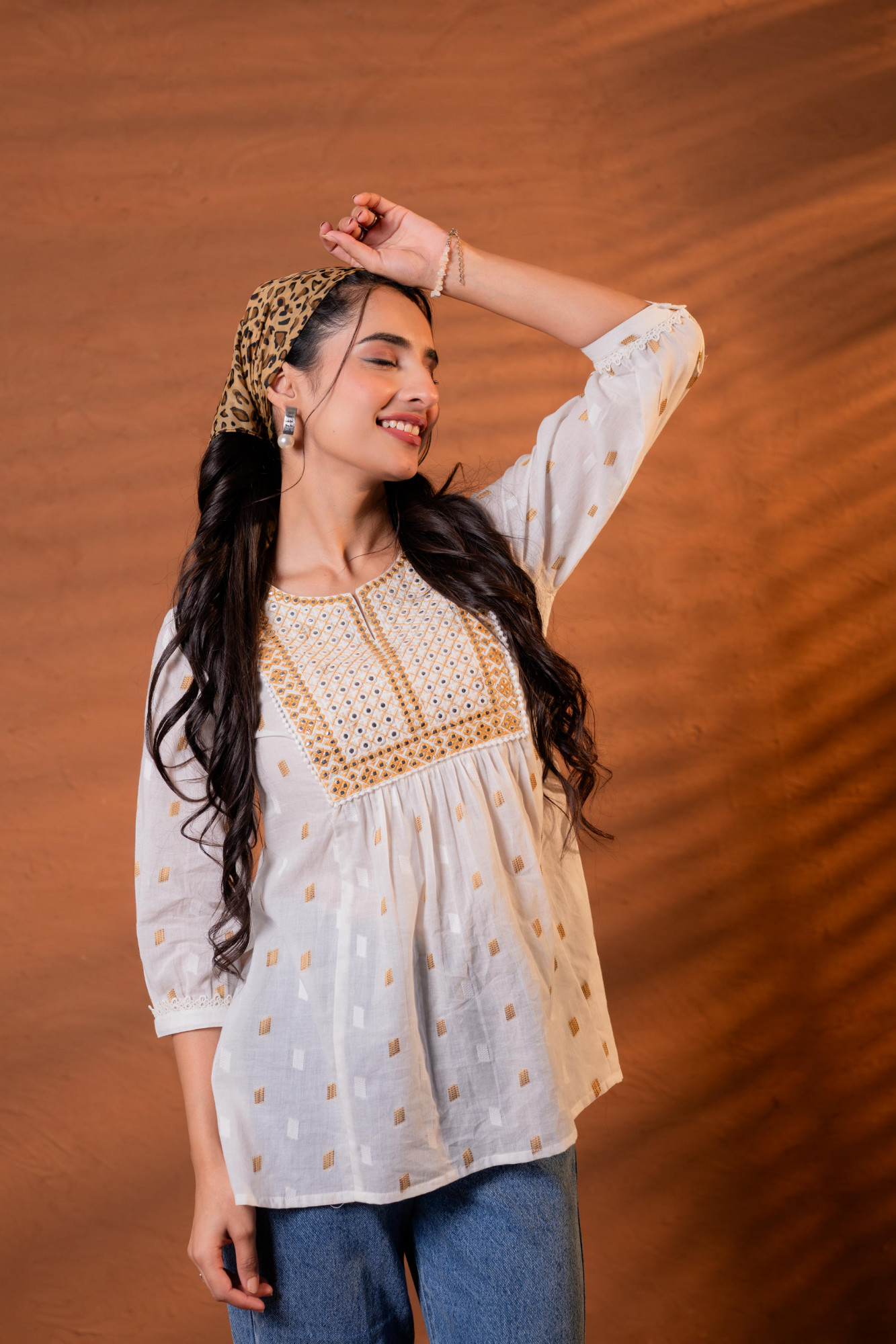A breezy off-white tunic enriched with delicate zari-inspired motifs and an intricately embroidered yoke. Designed with a soft gathered flare, this piece beautifully blends traditional elegance with modern comfort, making it perfect for effortless everyday ethnic styling.Pack of Content :- 1 TUNIC Top Type :- Tunic Top Pattern :- Embroidered Print Type :- Ethnic Top Fabric :- Cotton Top Design Styling :- Short A-Line Tunic Top Hemline :- slightly curved Top Length :- Hip length Top Shape :- A-Line Neck :- Round neck with slit Sleeve Length :- Three-quarter sleeves Occasion :- Casual Ornamentation :- Threads,Sequins Fit :- Fit & Flare