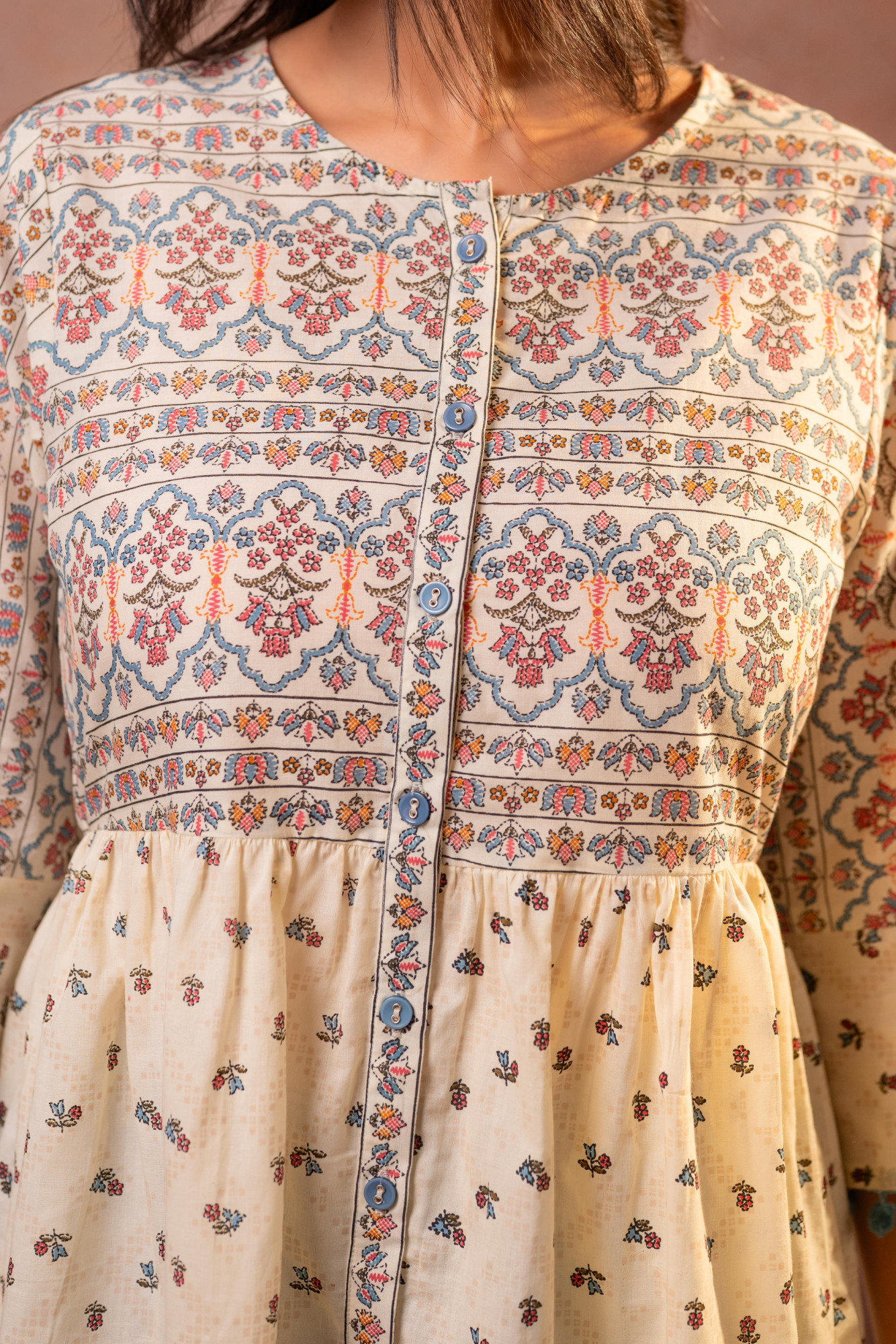 This elegantoff-white ethnic tunic features traditional all-over block-inspired prints with delicate detailing. Designed in a flared silhouette, it offers a comfortable fit with a classic round neckline and button-down front. Tassel , pompom accents on the hem and sleeves add a festive charm, making it perfect for casual ethnic outings and light celebrations.Pack of Content Each Size Set:- 1 TUNIC Top Type :- Tunic Top Pattern :- Printed Print Type :- Ajrakh-inspired Top Fabric :- Cotton Top Design Styling :- A-line Short Kurta Top Hemline :- Flared Top Length :- Mid-thigh length Top Shape :- A-line Neck :- Round neck Sleeve Length :- Three-quarter sleeves Sleeve Styling :- Regular Top Closure :- Slip-on Occasion :- Casual Ornamentation :- Buttons,PomPom