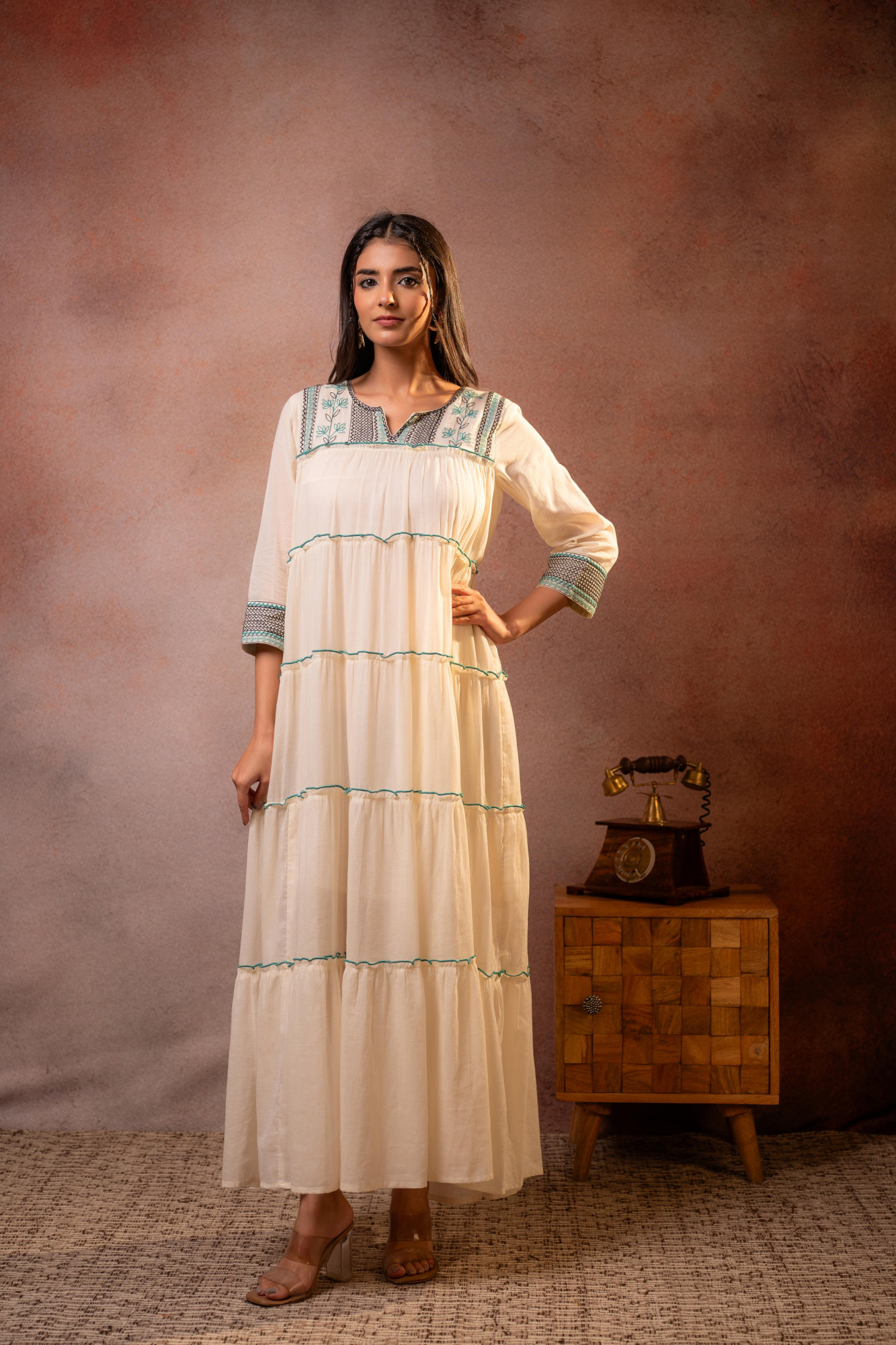 A soft and elegant off-white long dress featuring delicate embroidery on the yoke and subtle sage green & black accents. Designed with multiple gathered tiers, this dress offers a graceful flow and relaxed silhouette, making it a perfect blend of minimal sophistication and bohemian charm.Pack of Content :- 1 LONGDRESS Top Type :- Dress Top Pattern :- Embroidered Print Type :- Floral Top Fabric :- Cotton Top Design Styling :- A-Line tiered maxi dress Top Hemline :- Flared Top Length :- Ankle-length Top Shape :- A-Line Neck :- Round neck with slit Sleeve Length :- Three-quarter sleeves Occasion :- Casual Ornamentation :- Threads,Piping Fit :- Fit & Flare