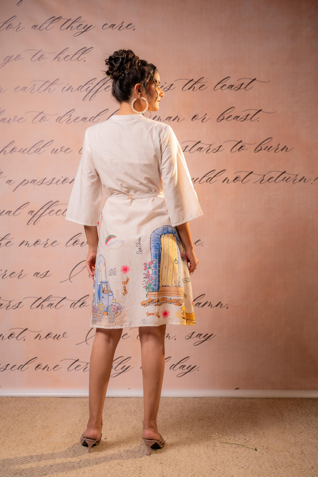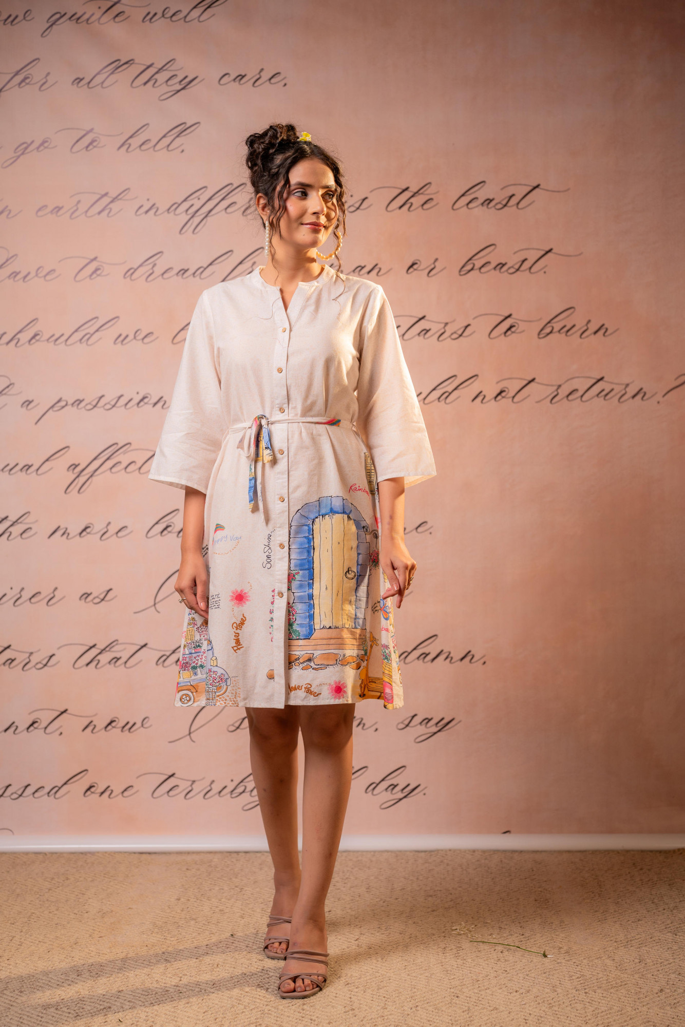 A playful yet sophisticated off-white shirt mini dress featuring delicate micro prints and artistic placement illustrations along the hem. Designed with a structured collar, front button placket, and adjustable waist tie, this piece blends contemporary tailoring with whimsical storytelling elements—perfect for creative daywear styling.Pack of Content :- 1 SHORTDRESS, 1 BELTTop Type :- Dress Top Pattern :- Printed Print Type :- Scenic Top Fabric :- Cotton Top Design Styling :- Straight shirt-style mini dress Top Hemline :- Curved Top Length :- Above Knee Top Shape :- A-line Neck :- Mandarincollar Sleeve Length :- Three-quarter sleeves Top Closure :- Front button-down >Ornamentation :- Buttons,Belt