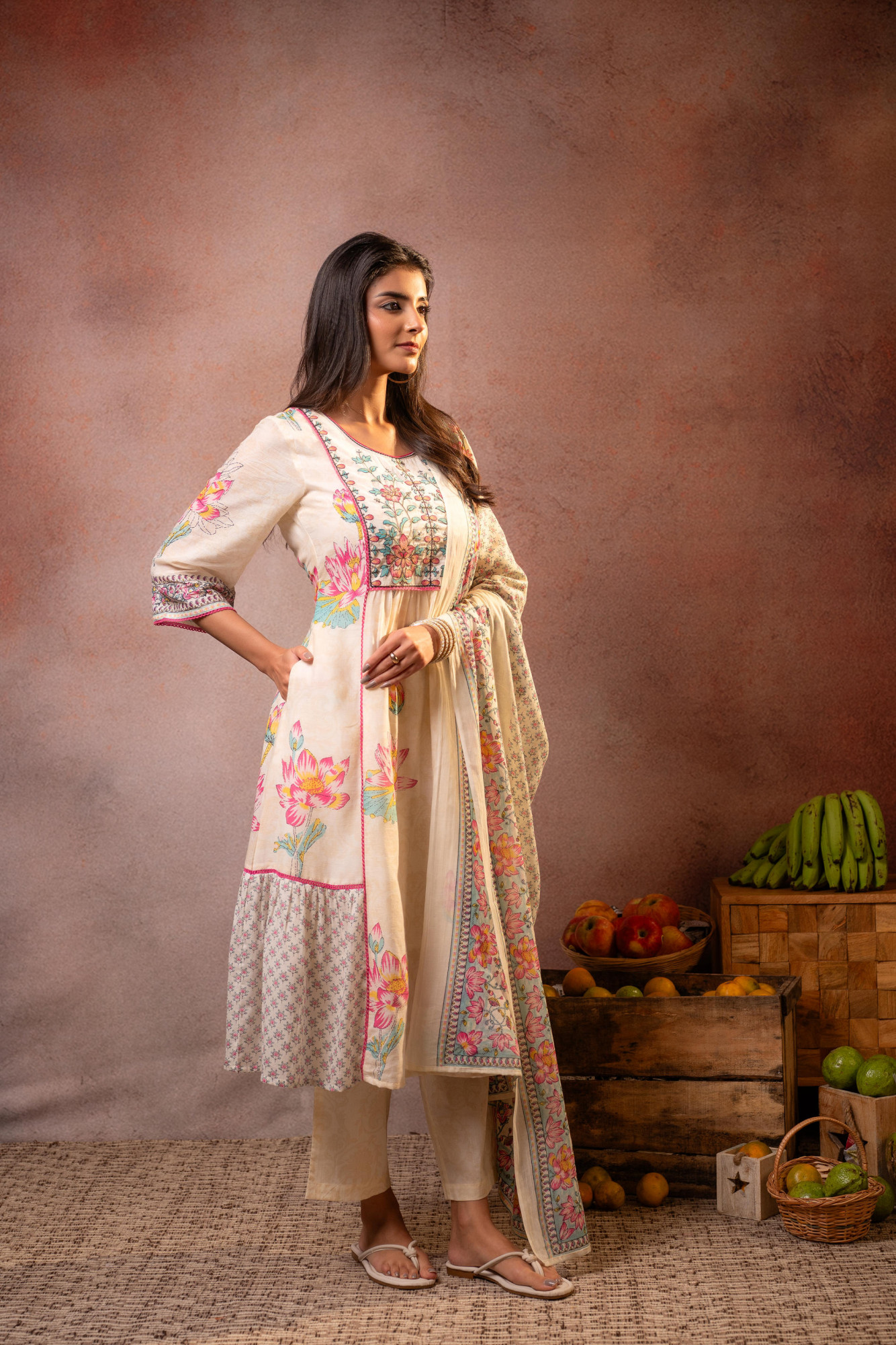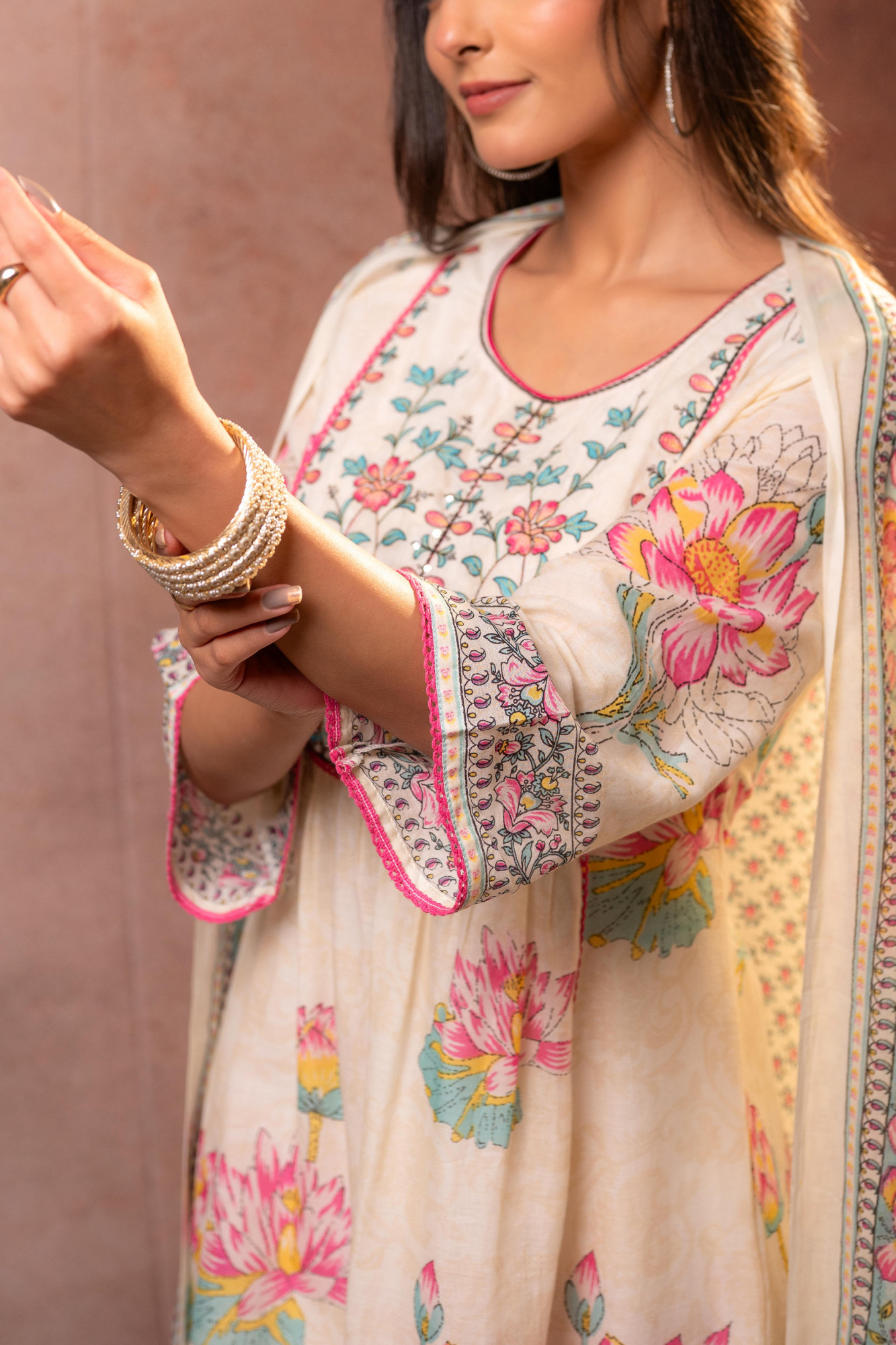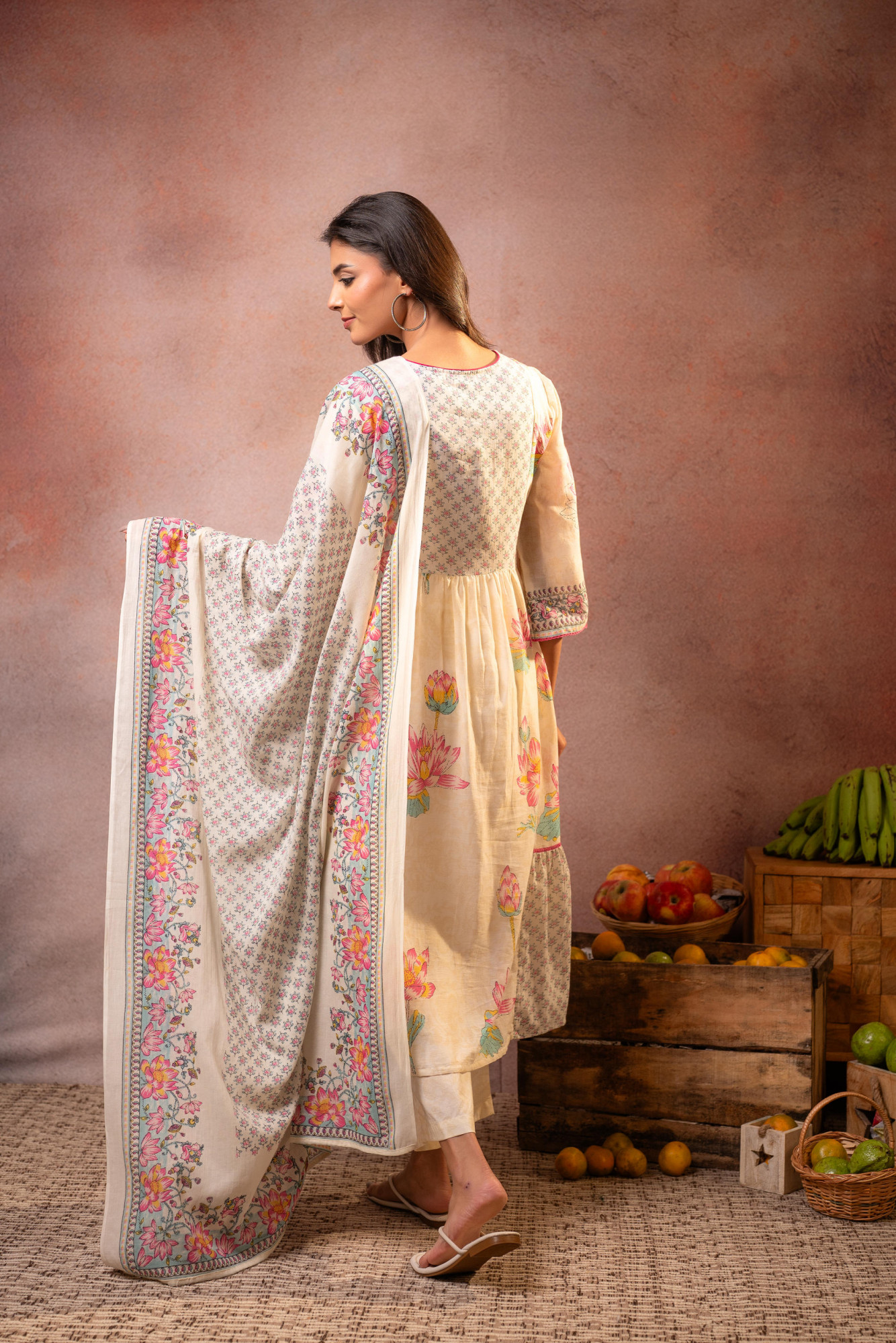An elegant offwhite kurta set adorned with vibrant lotus floral prints . Paired with straight bottoms and a beautifully printed dupatta, this ensemble captures a perfect harmony of traditional artistry and soft feminine charm—ideal for graceful day celebrations.Pack of Content :- 1 KURTA, 1 PANT, 1 DUPATTA Top Type :- Kurta Dupatta(Yes, No) :- Yes Top Pattern :- Printed Print Type :- Floral Top Fabric :- Cotton Top Design Styling :- A-line gathered kurta Top Hemline :- Flared Top Length :- Calf-length Top Shape :- A-Line Neck :- Round Sleeve Length :- Three-quarter sleeves Bottom Type :- Pant Bottom Fabric :- Cotton Bottom Pattern :- Solid Waistband :- Partially elasticated Occasion :- Semi festive Ornamentation :- Threads,Lace Dupatta Fabric :- Cotton Dupatta Pattern :- Printed Fit :- Fit & Flare