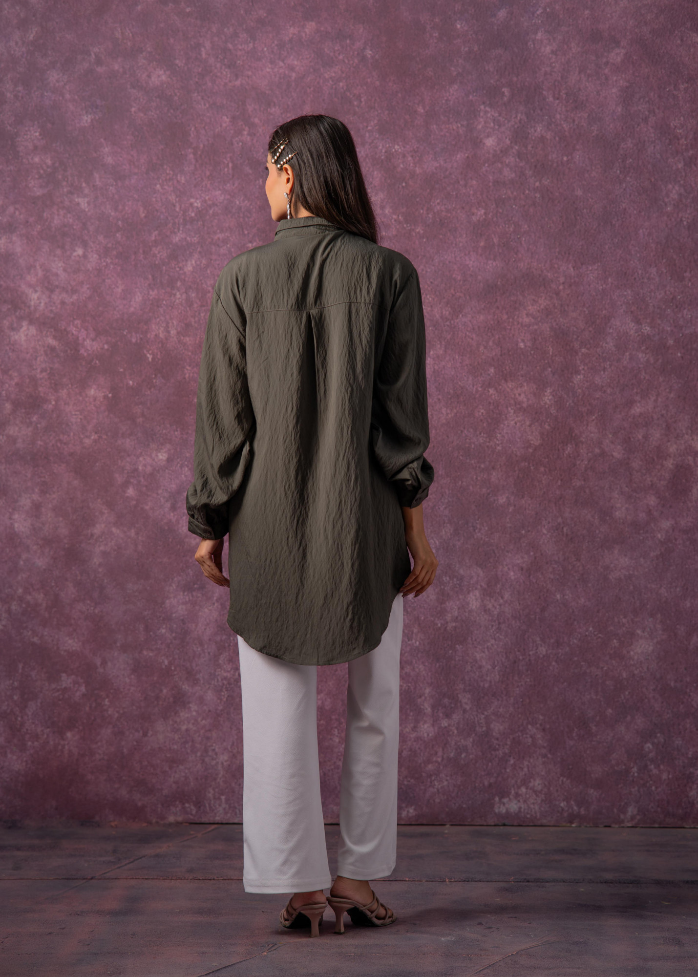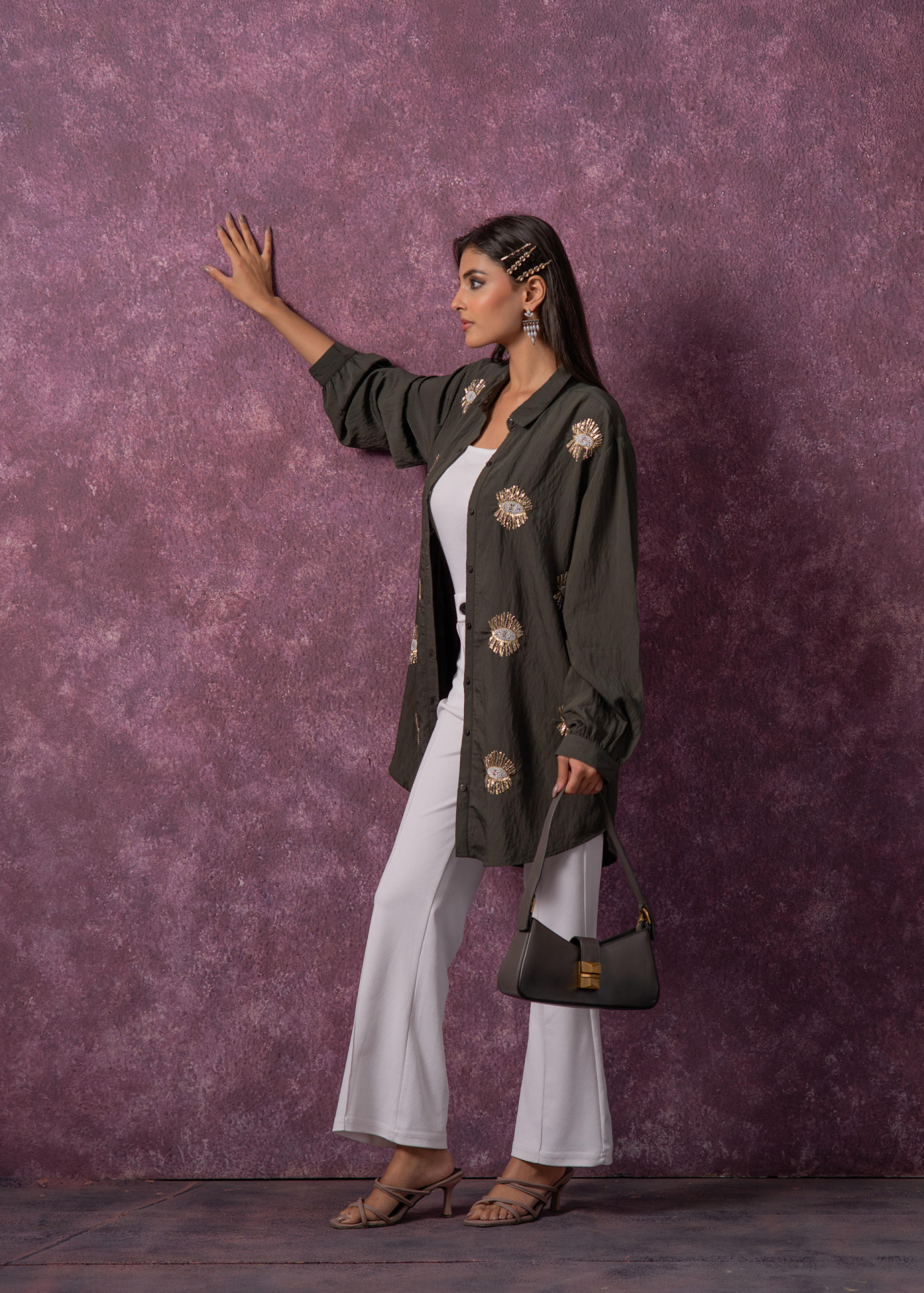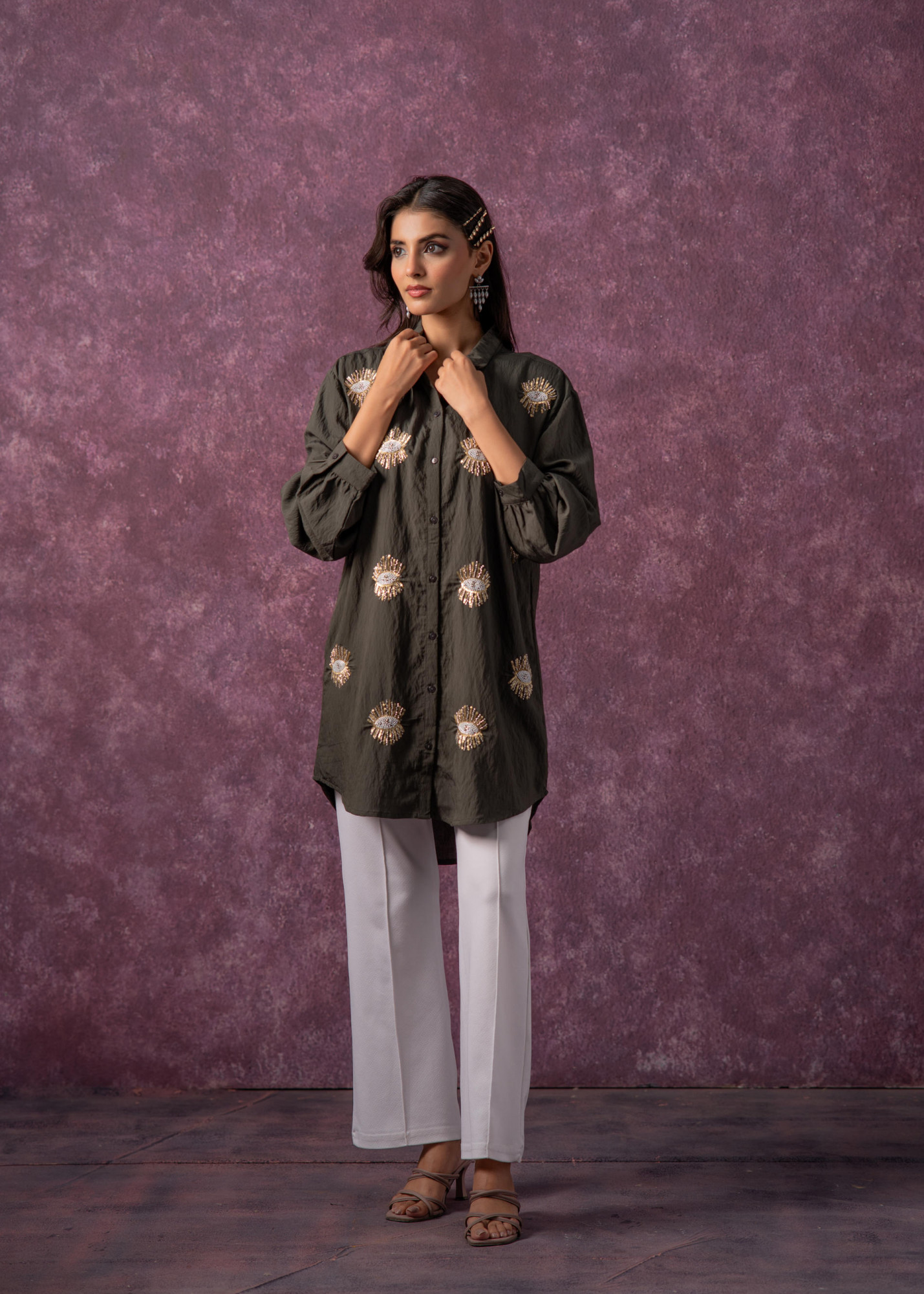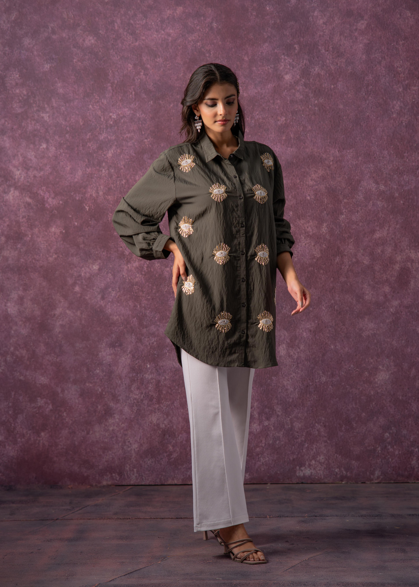 This olive green shirt-style tunic brings together contemporary charm and traditional detailing. Crafted from textured fabric, it features intricate beaded “eye” motifs with gold and silver accents. The relaxed silhouette, full sleeves, and button-down front make it a versatile piece—ideal for casual evenings, festive brunches, or fusion events.Each Size 1 Shirt Top Type :- 1 Shirt Top Pattern :- Embellished Print Type :- Statement Embroidery Top Fabric :- Viscose Top Design Styling :- Shirt Top Hemline :- Straight Top Length :- Mid-thigh length Top Shape :- Straight Neck :- Shirt Collar Sleeve Length :- Full Sleeve Styling :- Regular cuffed Top Closure :- Front Button-down Occasion :- Semi-Festive Ornamentation :- Metallic Threads,Beads,Sequins