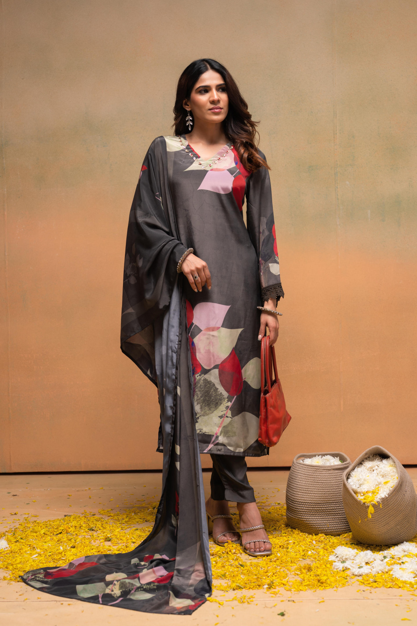 Celebrate festive moments with this Olive set crafted from soft manmade fiber. Features a floral printed kurta with V-neck, 3/4 sleeves, and side slits, paired with solid ankle-length pants and a printed dupatta with elegant sequence work.Each Size of Content :- 1 Kurta, 1 Pant, 1 Dupatta Top Type :- Kurta Dupatta(Yes, No) :- Yes Top Pattern :- Printed Print Type :- Floral Top Fabric :- Manmade Fiber Top Design Styling :- Straight Top Hemline :- Straight Top Length :- Calf Length Top Shape :- Straight Neck :- V-Neck Sleeve Length :- 3/4 Sleeve Sleeve Styling :- Regular Sleeve Bottom Fabric :- Manmade Fiber Bottom Type :- Yes Ornamentation :- Sequence Dupatta Fabric :- Manmade Fiber Fit :- Regular Fit