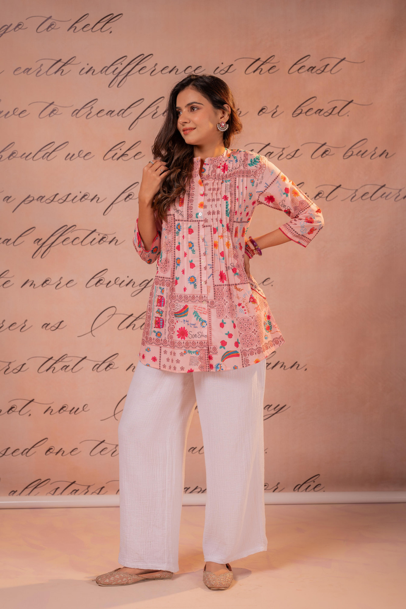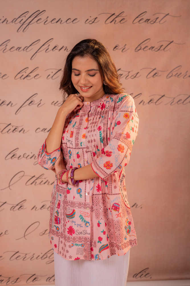 A refreshing and lively tunic crafted in a soothing onionpink base, adorned with vibrant floral and geometric patch-inspired prints. The design features a subtle pintuck yoke detail , creating a relaxed yet stylish silhouette. Perfect for everyday elegance with a touch of playful charm.Pack of Content :- 1 Tunic Top Type :- Tunic Top Pattern :- Printed Print/Pattern Type/Trend :- Floral Top Fabric :- Cotton Top Design Styling :- Patchwork Short A-Line Tunic Top Hemline :- Straight Top Length :- Hip length Top Shape :- A-Line Neck :- Mandarin collar Sleeve Length :- Three-quarter sleeves Top Closure :- Front button-down Occasion :- Casual Ornamentation :- ButtonsFit :- Fit & Flare