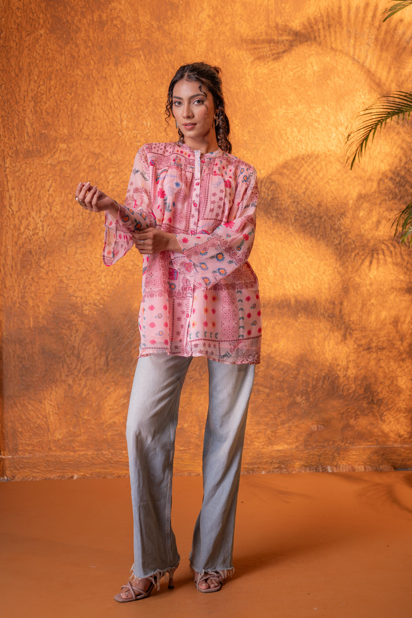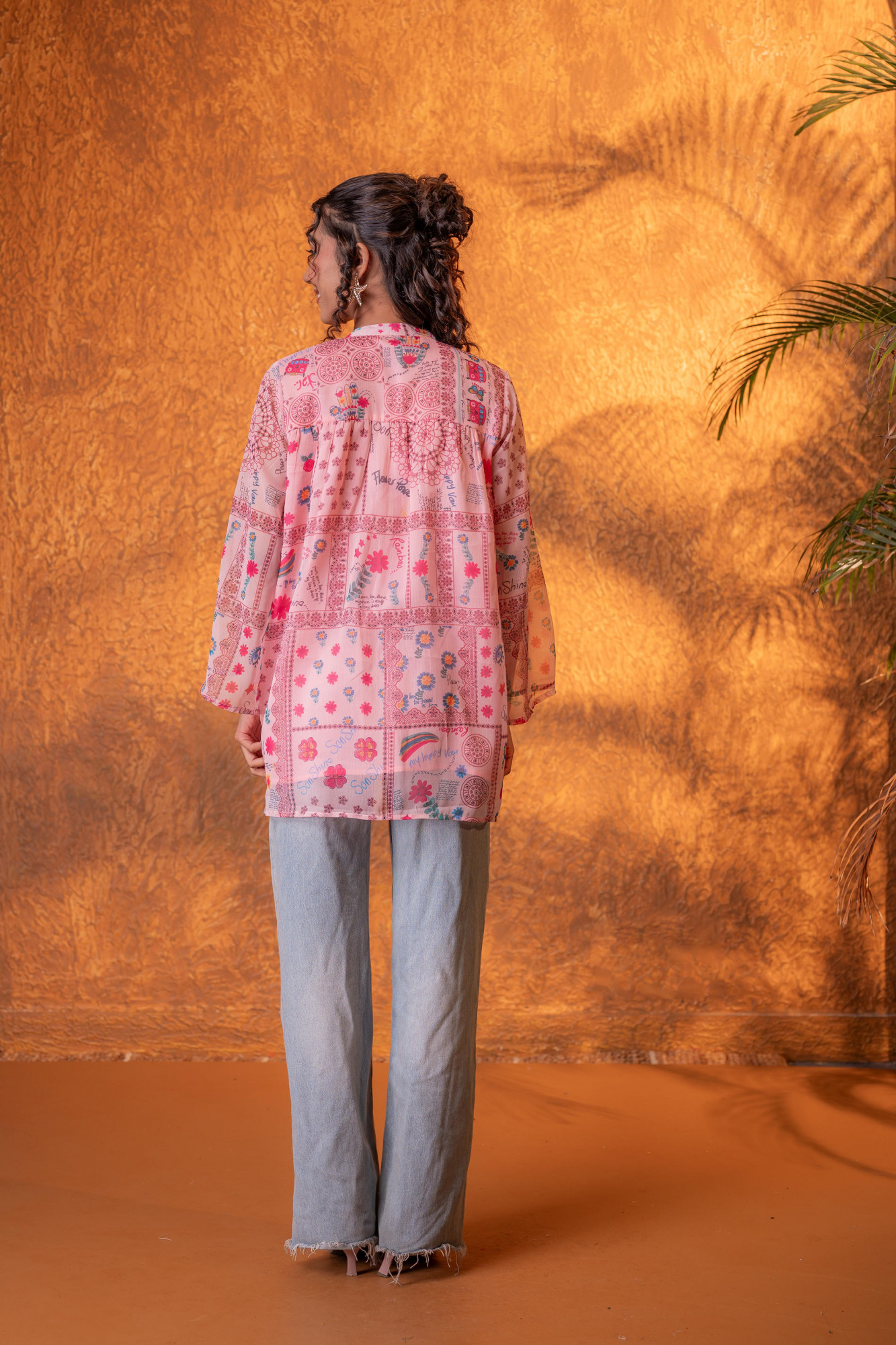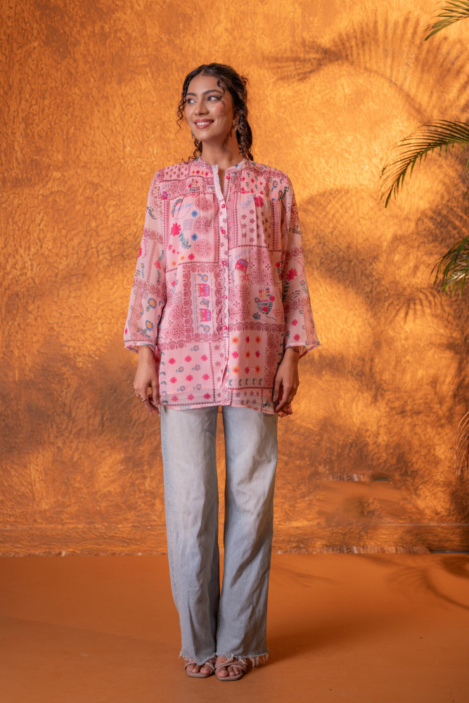 Playful and artistic, this onion pink shirt features a vibrant patchwork-inspired print with whimsical motifs and delicate geometric patterns. Designed with a relaxed silhouette and lightweight flowy fabric, the shirt offers effortless movement and comfort. The soft mandarin collar and flared sleeves add a contemporary bohemian touch, making it a perfect statement piece for casual outings, vacations, and creative styling.Pack of Content :- Contian:, 1 Shirt Top Type :- Shirt Top Pattern :- Printed Print/Pattern Type/Trend :- Patchwork Top Fabric :- Man Made Fiber Top Design Styling :- Straight shirt Top Hemline :- Rounded Top Length :- Hip length Top Shape :- Straight Neck :- Mandarin collar Sleeve Length :- Full Top Closure :- Front button closure Occasion :- Casual Ornamentation :- ButtonsFit :- Straight