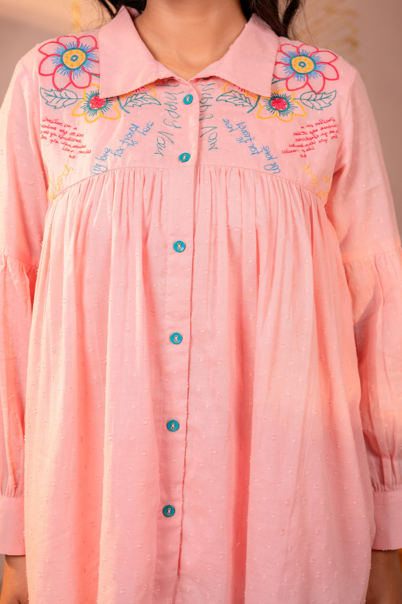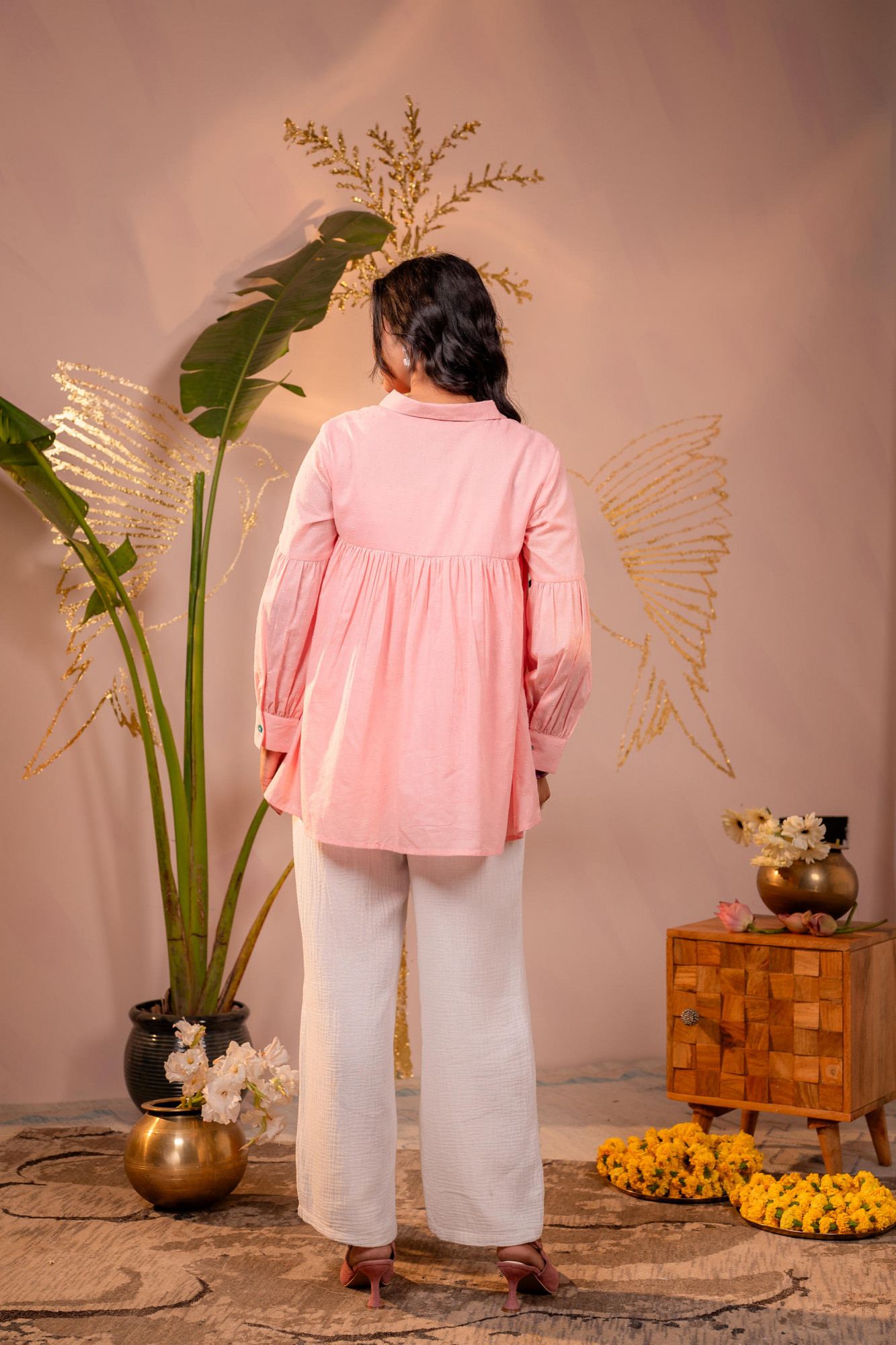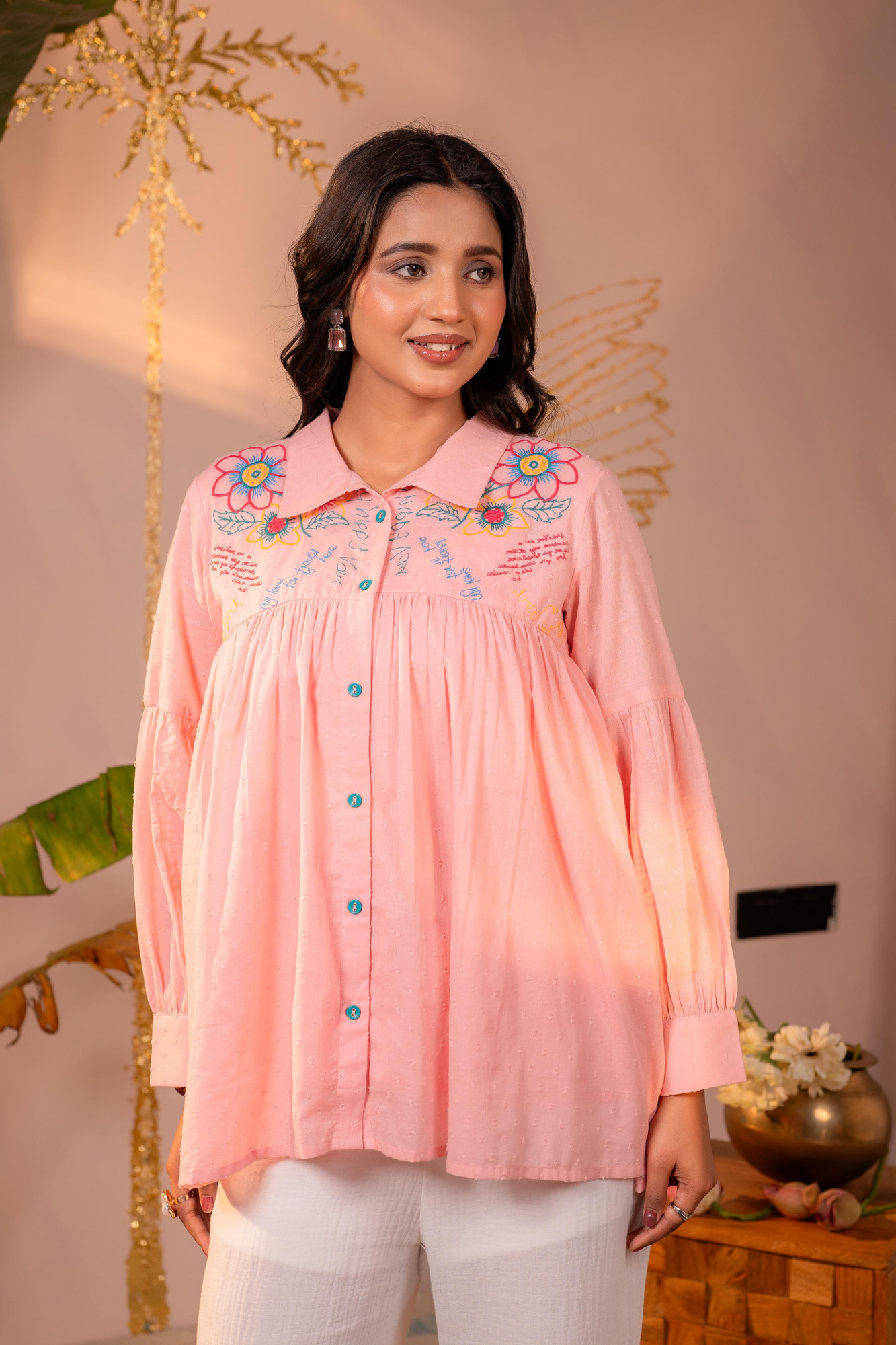 Soft and feminine, this onion pink gathered shirt features delicate print across the yoke, adding a subtle artisanal touch. Designed with a relaxed silhouette and gentle gathers below the yoke, the shirt creates a breezy and comfortable look. The contrast buttons enhance the playful aesthetic, while the full sleeves with cuff detailing add a refined finish. Perfect for casual outings, brunch dates, and effortless everyday style.Pack of Content :- Contian:, 1 Shirt Top Type :- Shirt Top Pattern :- Printed Print/Pattern Type/Trend :- Floral Top Fabric :- Cotton Top Design Styling :- Gathered yoke shirt with relaxed silhouette Top Hemline :- Curved Top Length :- Hip length Top Shape :- A-Line Neck :- Shirt collar Sleeve Length :- Full Top Closure :- Front button closure Occasion :- Casual Ornamentation :- ButtonsFit :- Fit & Flare