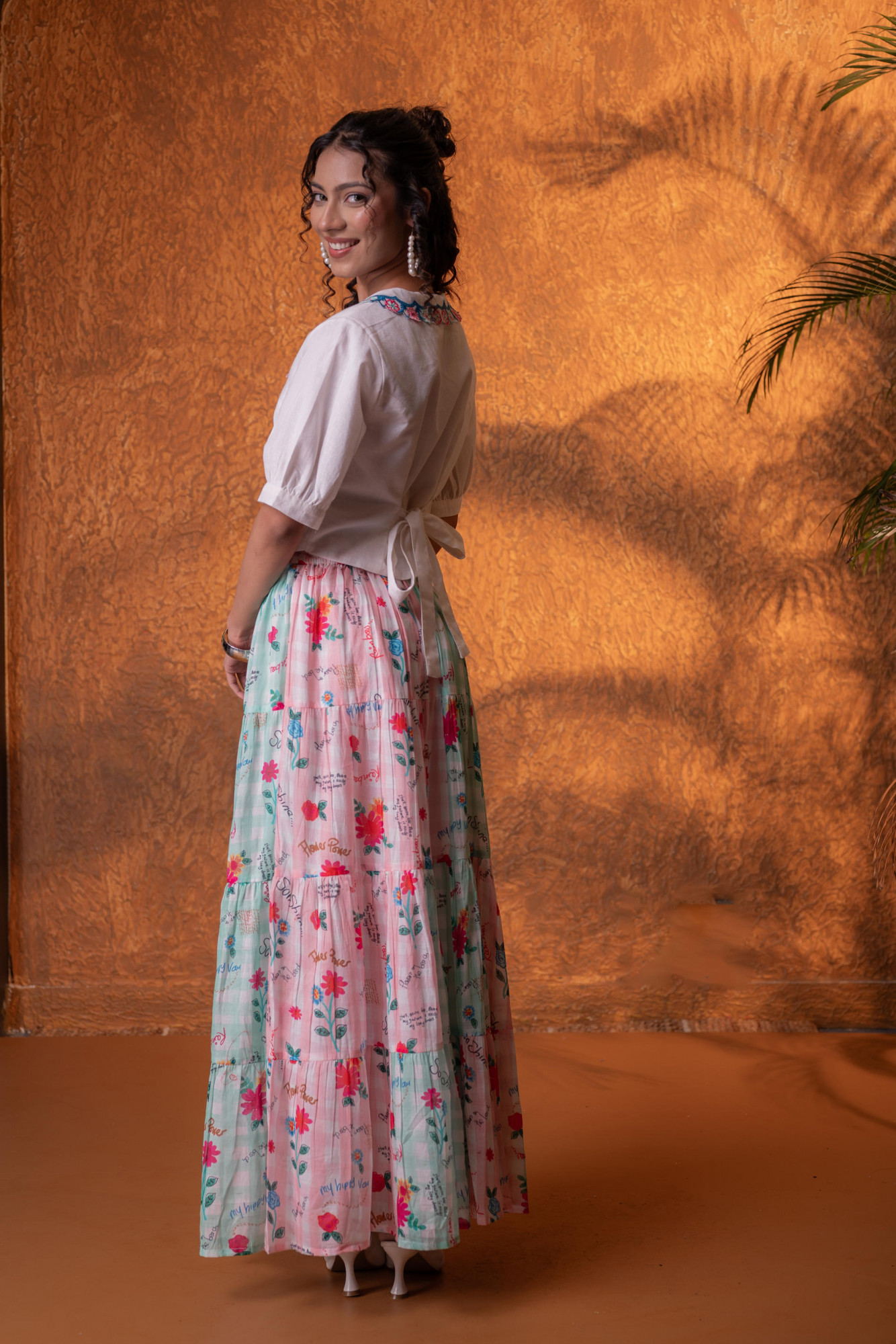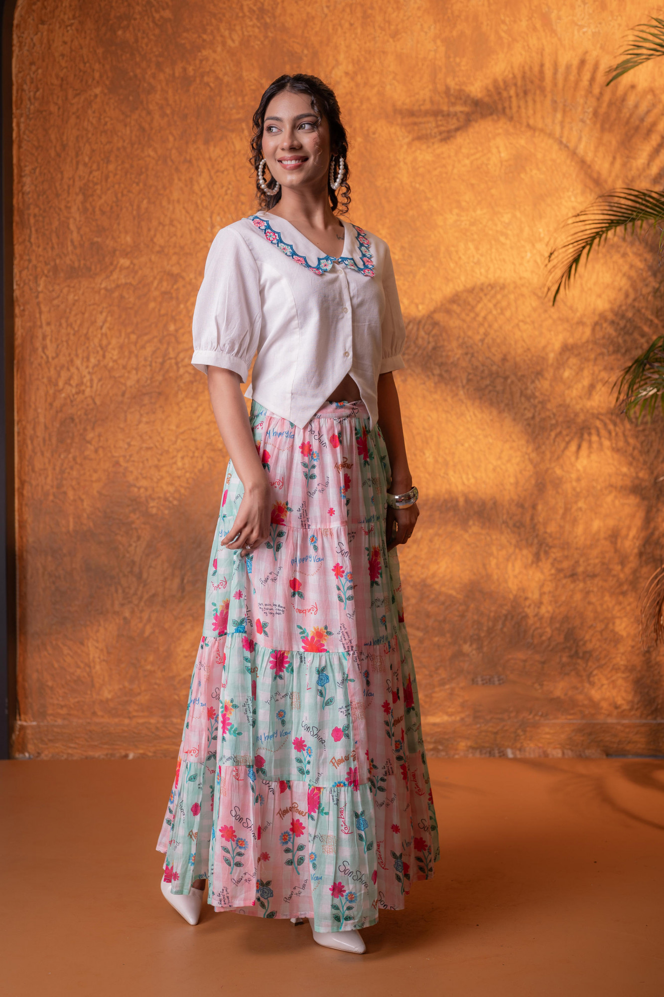 A soft and feminine co-ord set featuring a crisp white embroidered top paired with a flowy pastel floral skirt. The look blends vintage charm with modern ease, highlighted by delicate collar embroidery and a breezy tiered silhouette. Perfect for summer outings, brunches, and resort wear.Pack of Content :- 1 Top, 1 Skirt Top Type :- Tops Top Pattern :- Embroidered Print/Pattern Type/Trend :- Floral Top Fabric :- Cotton Top Design Styling :- Crop shirt style top Top Hemline :- Slight curved Top Length :- Above Waist Top Shape :- Straight Neck :- Peter Pan collar Sleeve Length :- Elbow length Top Closure :- Front button-down Bottom Fabric :- Cotton Bottom Type :- Skirt Occasion :- Casual Ornamentation :- Buttons,ThreadsFit :- Fit & Flare