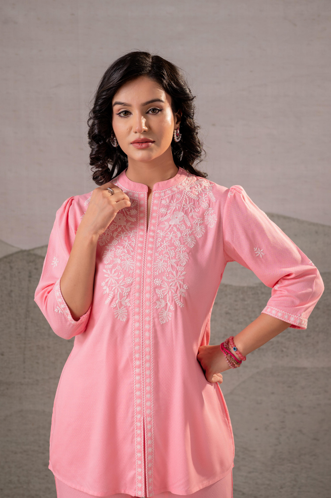 A vibrant peach co-ord set adorned with elegant white embroidery, designed for effortless festive dressing. Featuring a straight kurta with delicate threadwork and relaxed straight-fit pants, this ensemble brings together comfort, craftsmanship, and contemporary ethnic charm.Top Type :- Tunic Dupatta(Yes, No) :- No Top Pattern :- Embroidered Print Type :- Floral Top Fabric :- Viscose Top Design Styling :- Straight Short Kurta Top Hemline :- Straight Top Length :- Hip length Top Shape :- Straight Neck :- Round neck with slit Sleeve Length :- Three-quarter sleeves Sleeve Styling :- Regular Bottom Type :- Pant Bottom Fabric :- Viscose Bottom Pattern :- Solid Ornamentation :- Threads