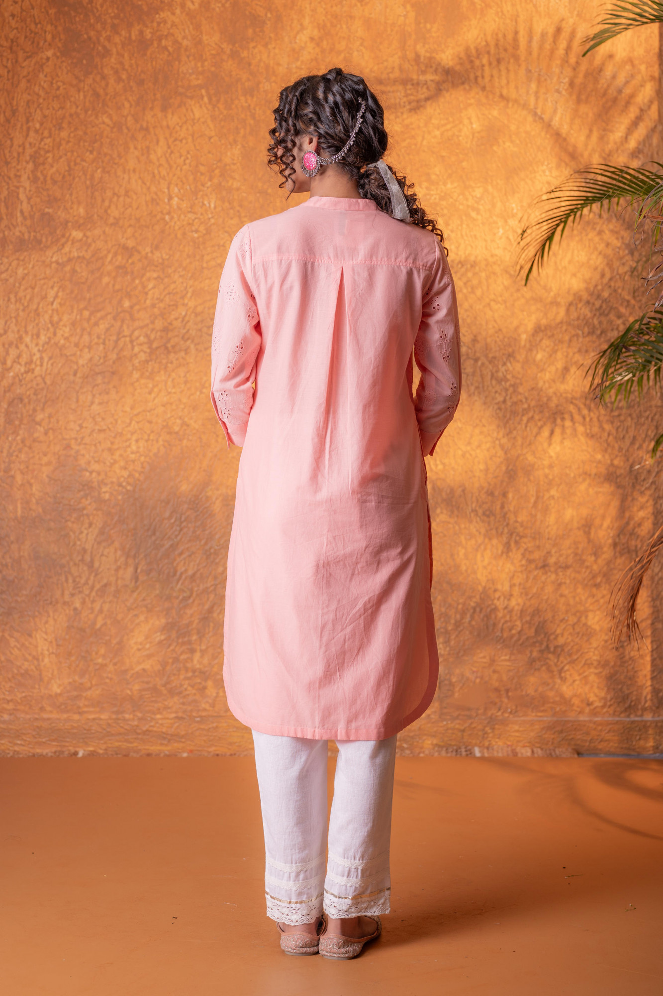 A refined peach kurta crafted with delicate all-over chikankari-inspired embroidery. Designed in a straight silhouette with a button-down front, this kurta balances minimal elegance with handcrafted finesse, perfect for everyday ethnic styling.Pack of Content Each Size Set:- 1 KURTA Top Type :- Kurta Top Pattern :- Embroidered Print Type :- Chikankari Top Fabric :- Cotton Top Design Styling :- Straight Kurta Top Hemline :- Straight with soft rounded edges Top Length :- Knee length Top Shape :- Straight Neck :- Round neckline with short stand collar Sleeve Length :- Three-quarter sleeves Sleeve Styling :- Regular Top Closure :- Full front button-down placket Occasion :- Casual Ornamentation :- Buttons