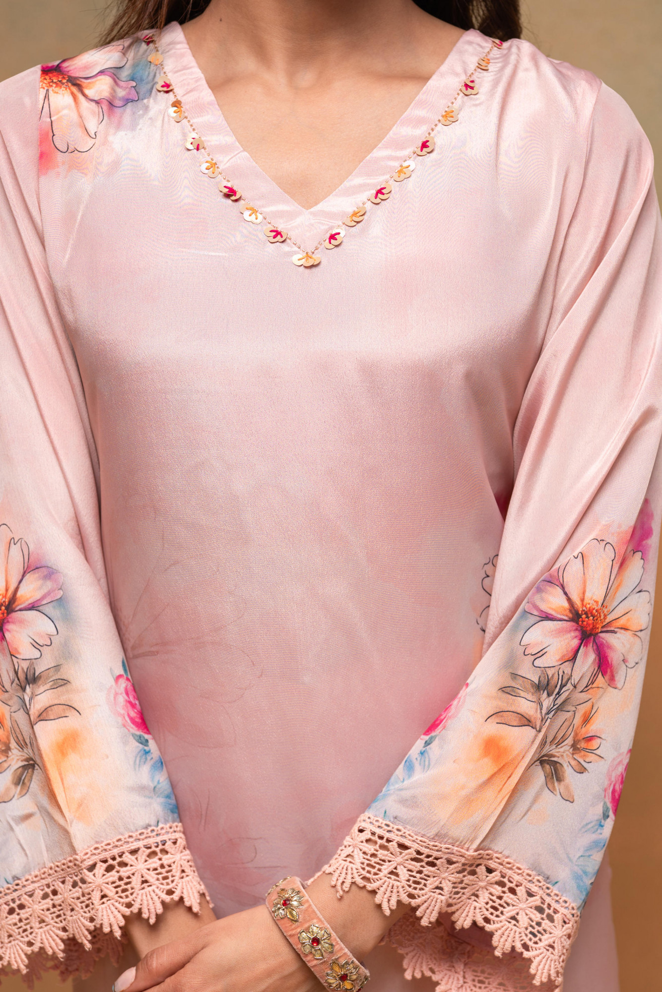 Celebrate festive moments with this peach set crafted from soft manmade fiber. Features a floral printed kurta with V-neck, 3/4 sleeves, and side slits, paired with solid ankle-length pants and a printed dupatta with elegant sequence work.Each Size of Content :- 1 Kurta, 1 Pant, 1 Dupatta Top Type :- Kurta Dupatta(Yes, No) :- Yes Top Pattern :- Printed Print Type :- Floral Top Fabric :- Manmade Fiber Top Design Styling :- Straight Top Hemline :- Straight Top Length :- Calf Length Top Shape :- Straight Neck :- V-Neck Sleeve Length :- 3/4 Sleeve Sleeve Styling :- Regular Sleeve Bottom Fabric :- Manmade Fiber Bottom Type :- Yes Ornamentation :- Sequence Dupatta Fabric :- Manmade Fiber Fit :- Regular Fit
