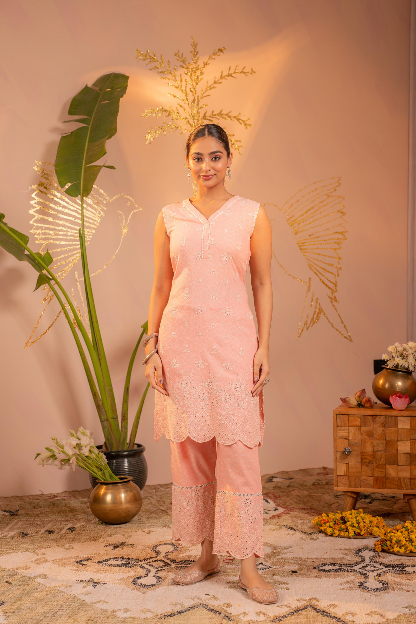 A soothing peach kurta set crafted with delicate all-over schiffli-inspired embroidery. The sleeveless V-neck kurta features intricate tonal threadwork and a scalloped embroidered hem, paired with coordinated straight pants detailed with subtle border embroidery. Light, graceful, and timeless — perfect for understated festive elegance.Pack of Content :- 1 KURTA, 1 PANTTop Type :- Kurta Top Pattern :- Embroidered Print Type :- Schiffli Top Fabric :- Man Made Fiber Top Design Styling :- Straight Kurta Top Hemline :- Scalloped Top Length :- Knee length Top Shape :- Straight Neck :- V-neck Top Closure :- Slip-on Bottom Fabric :- Man Made Fiber Bottom Type :- Pant Bottom Pattern :- Embroidered Waistband :- Partially elasticated Ornamentation :- Lace, Threads