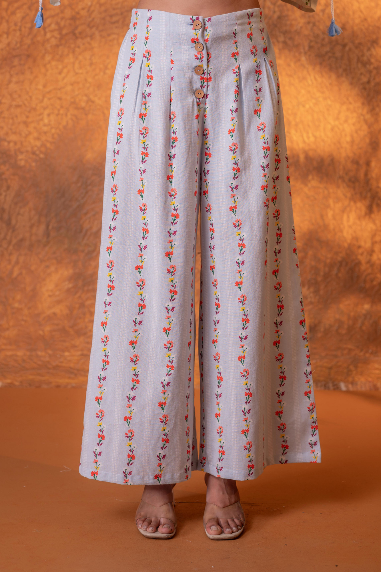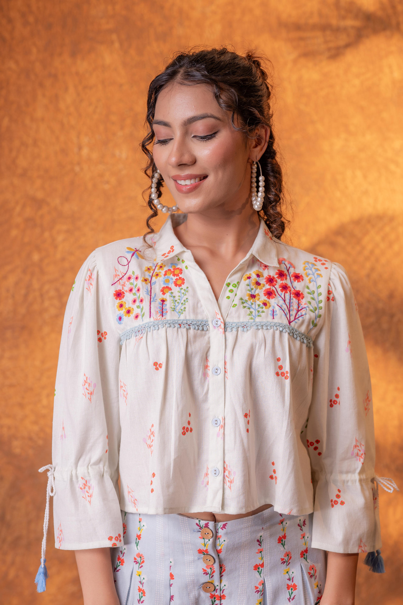 A graceful co-ord set featuring delicate floral print and vertical printed motifs. The cropped stirt-style top is highlighted with a heavy yoke and playful tassel details, paired with flowy palazzo pants for an effortless blend of comfort and artisanal charm—perfect for sunlit festive days.Top Type :- Tops Dupatta(Yes, No) :- No Top Pattern :- Printed Print Type :- Floral Top Fabric :- Cotton Top Design Styling :- Boxy Fit Crop Shirt Top Hemline :- Straight Top Length :- Waist length Top Shape :- Boxy Neck :- Shirt collar Sleeve Length :- Three-quarter sleeves Sleeve Styling :- Regular with tassel tie detail Bottom Type :- Pant Bottom Fabric :- Cotton Bottom Pattern :- Printed Ornamentation :- Dori,Tasseles,Buttons,Lace