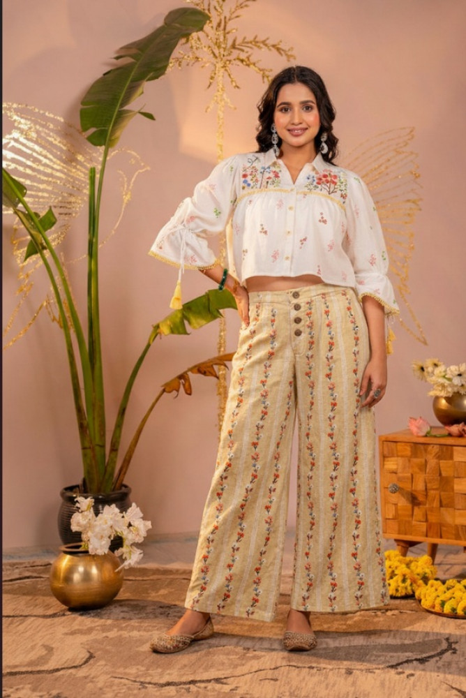 A graceful co-ord set featuring delicate floral print and vertical printed motifs. The cropped stirt-style top is highlighted with a heavy yoke and playful tassel details, paired with flowy palazzo pants for an effortless blend of comfort and artisanal charm—perfect for sunlit festive days.Top Type :- Tops Dupatta(Yes, No) :- No Top Pattern :- Printed Print Type :- Floral Top Fabric :- Cotton Top Design Styling :- Boxy Fit Crop Shirt Top Hemline :- Straight Top Length :- Waist length Top Shape :- Boxy Neck :- Shirt collar Sleeve Length :- Three-quarter sleeves Sleeve Styling :- Regular with tassel tie detail Bottom Type :- Pant Bottom Fabric :- Cotton Bottom Pattern :- Printed Ornamentation :- Dori,Tasseles,Buttons,Lace