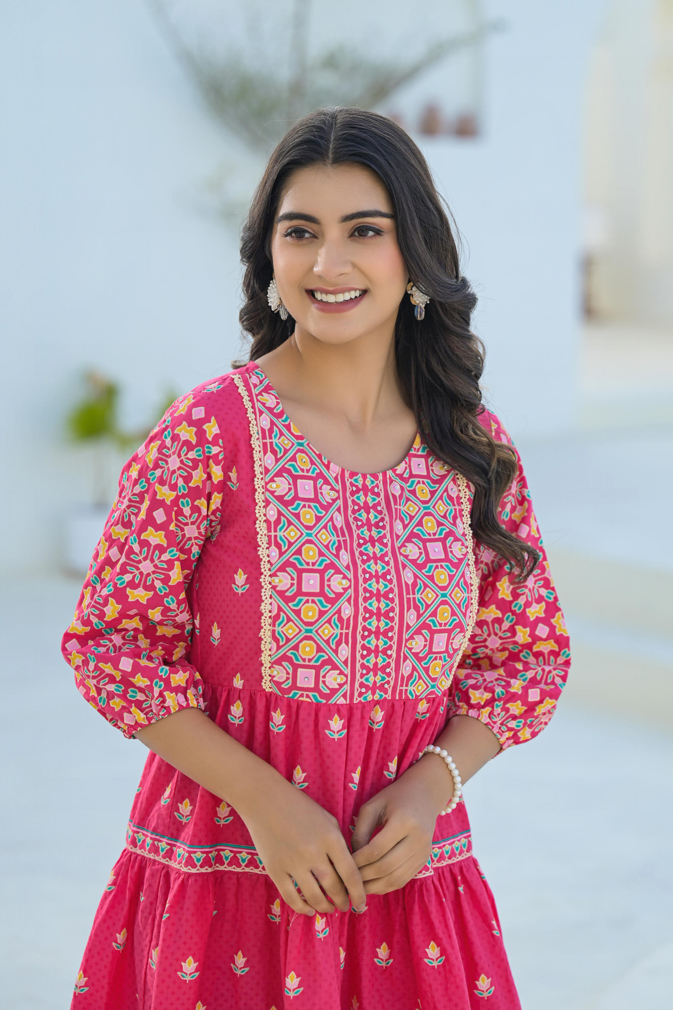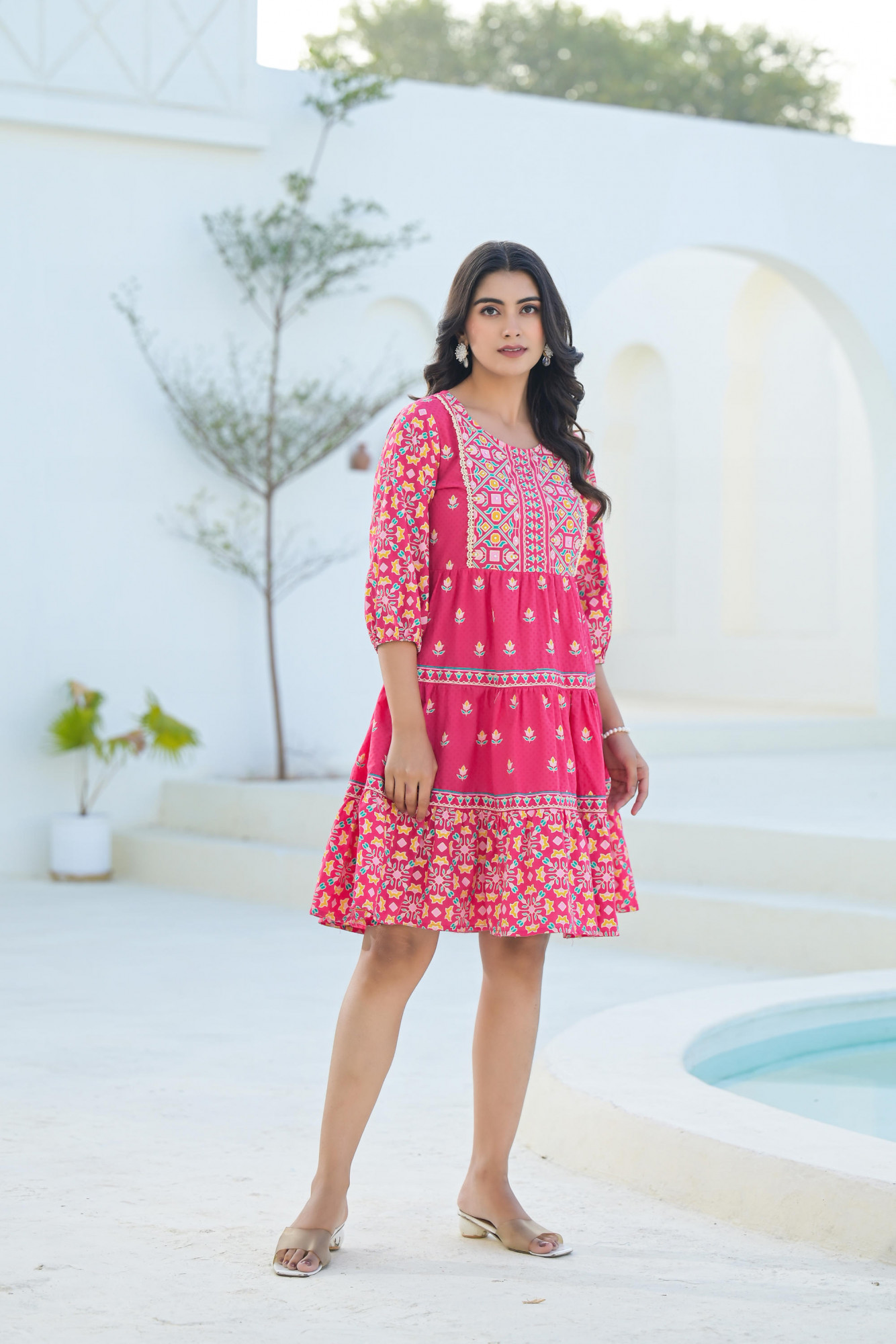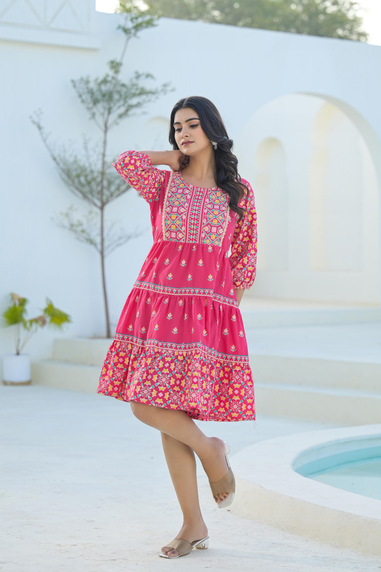 Pink charming fit & flare short dress adorned with ethnic motifs. Accentuated with sequins, beads, and delicate lace detailing, it boasts a round neckline and three-quarter regular sleeves, adding a touch of sophistication to its playful silhouette.Pack of Content :- 1 Long dress Color :- Pink Top Type :- Dress Top Pattern :- Printed Print Type :- Ethnic Motif Top Fabric :- Cotton Top Design Styling :- Panelled Top Hemline :- A-line Top Length :- Knee length Top Shape :- Fit & Flare Neck :- Round Neck Sleeve Length :- Three Quarter Sleeves Top Closure :- Slip-On Ornamentation :- Sequins, Beads & Lace Length in Inch :- 38''