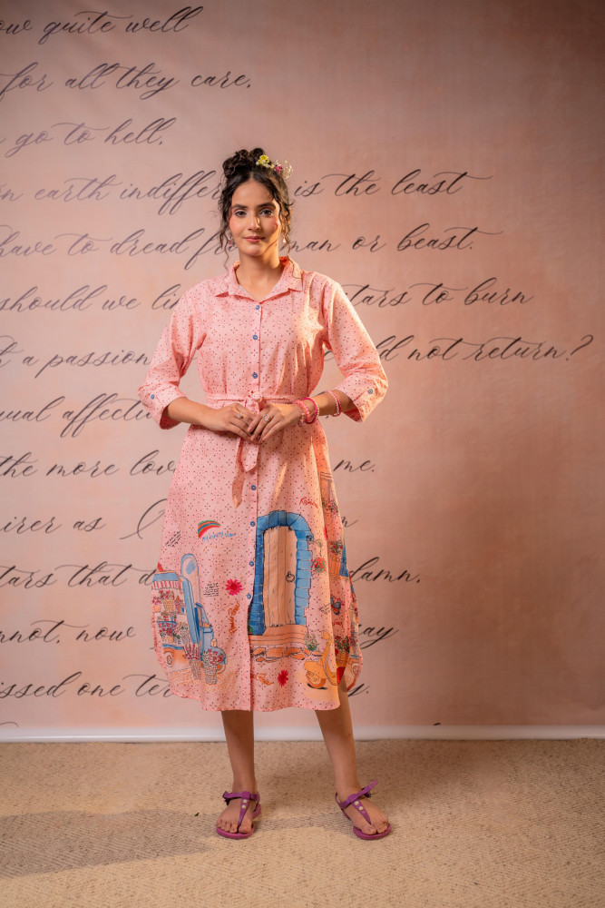 A playful yet sophisticated pink shirt dress featuring delicate micro prints and artistic placement illustrations along the hem. Designed with a structured collar, front button placket, and adjustable waist tie, this piece blends contemporary tailoring with whimsical storytelling elements—perfect for creative daywear styling.Pack of Content :- 1 LONGDRESS, 1 BELTTop Type :- Dress Top Pattern :- Printed Print Type :- Scenic Top Fabric :- Cotton Top Design Styling :- Straight shirt-style dress Top Hemline :- Curved Top Length :- Knee length Top Shape :- Straight Neck :- Shirt collar Sleeve Length :- Three-quarter sleeves Top Closure :- Front button-down >Ornamentation :- Buttons,Belt