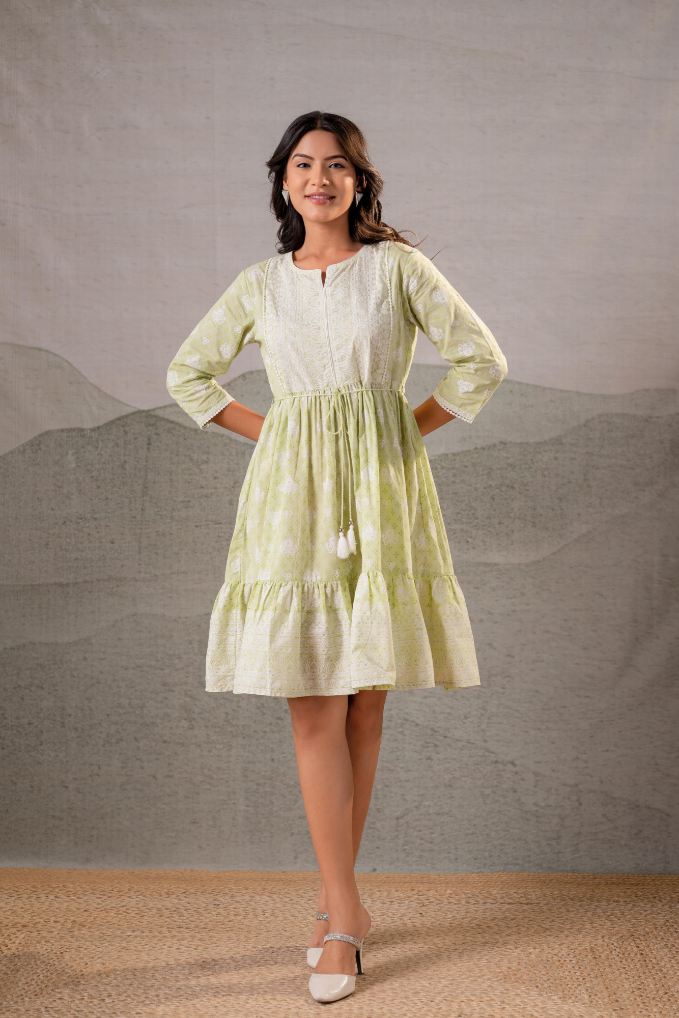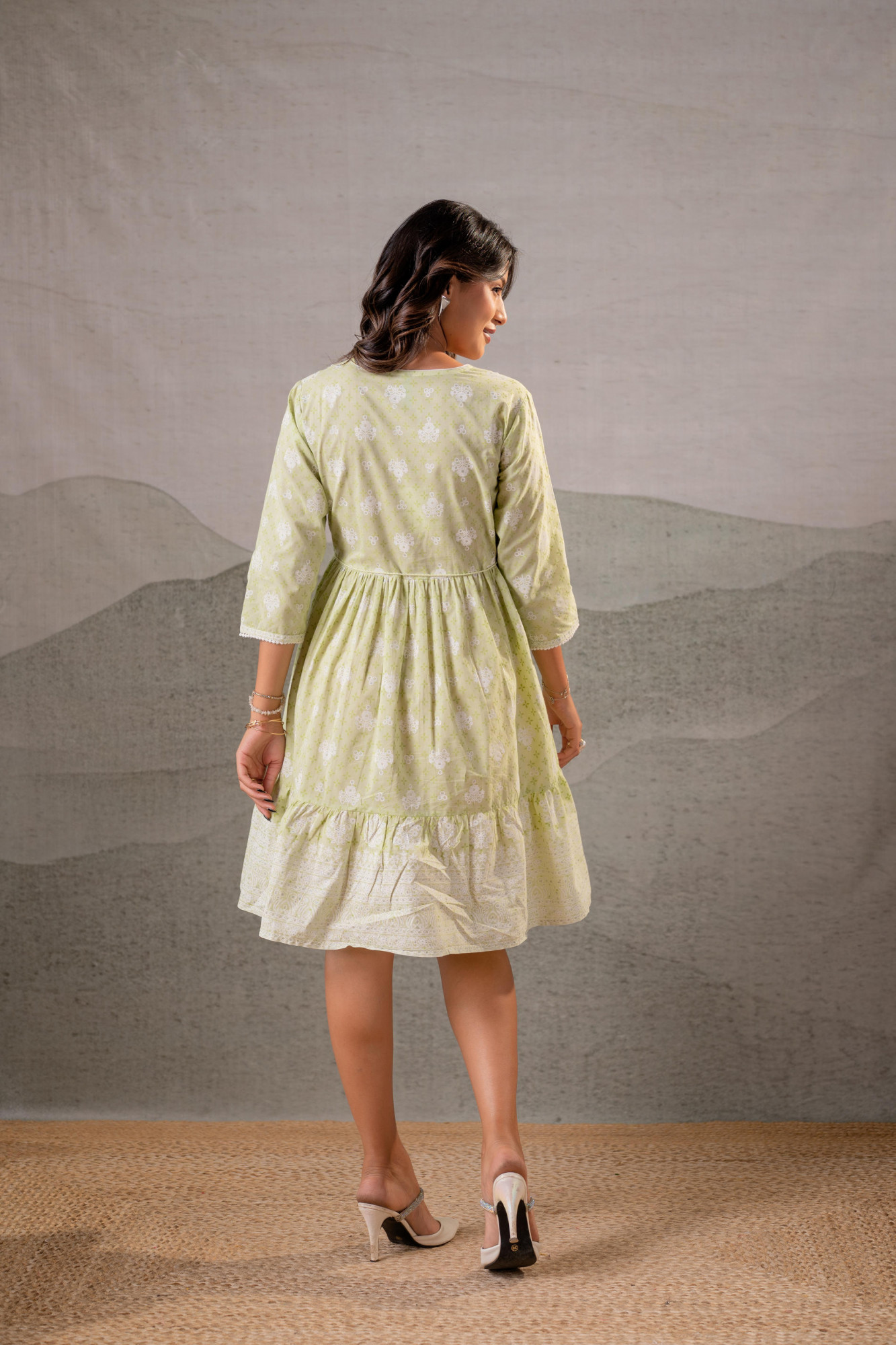 A radiant pista green flared dress featuring a delicately heavy printed yoke and soft handblock-inspired motifs. Designed with a cinched empire waist and gathered tier, this piece blends tradition with playful femininity. Light, breezy, and graceful in movement, it is perfect for daytime festivities and summer celebrations.