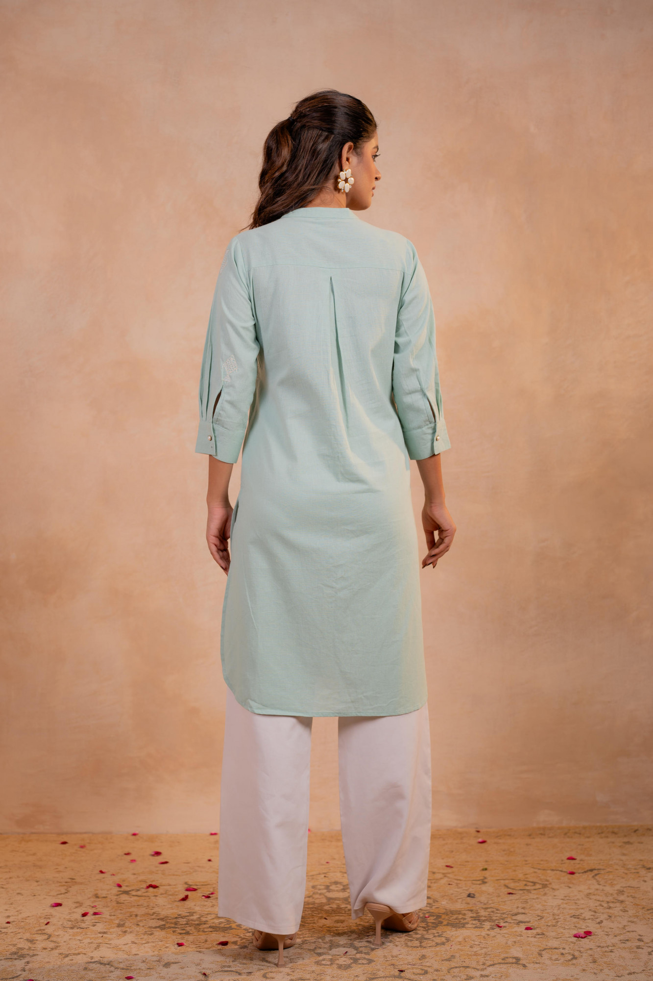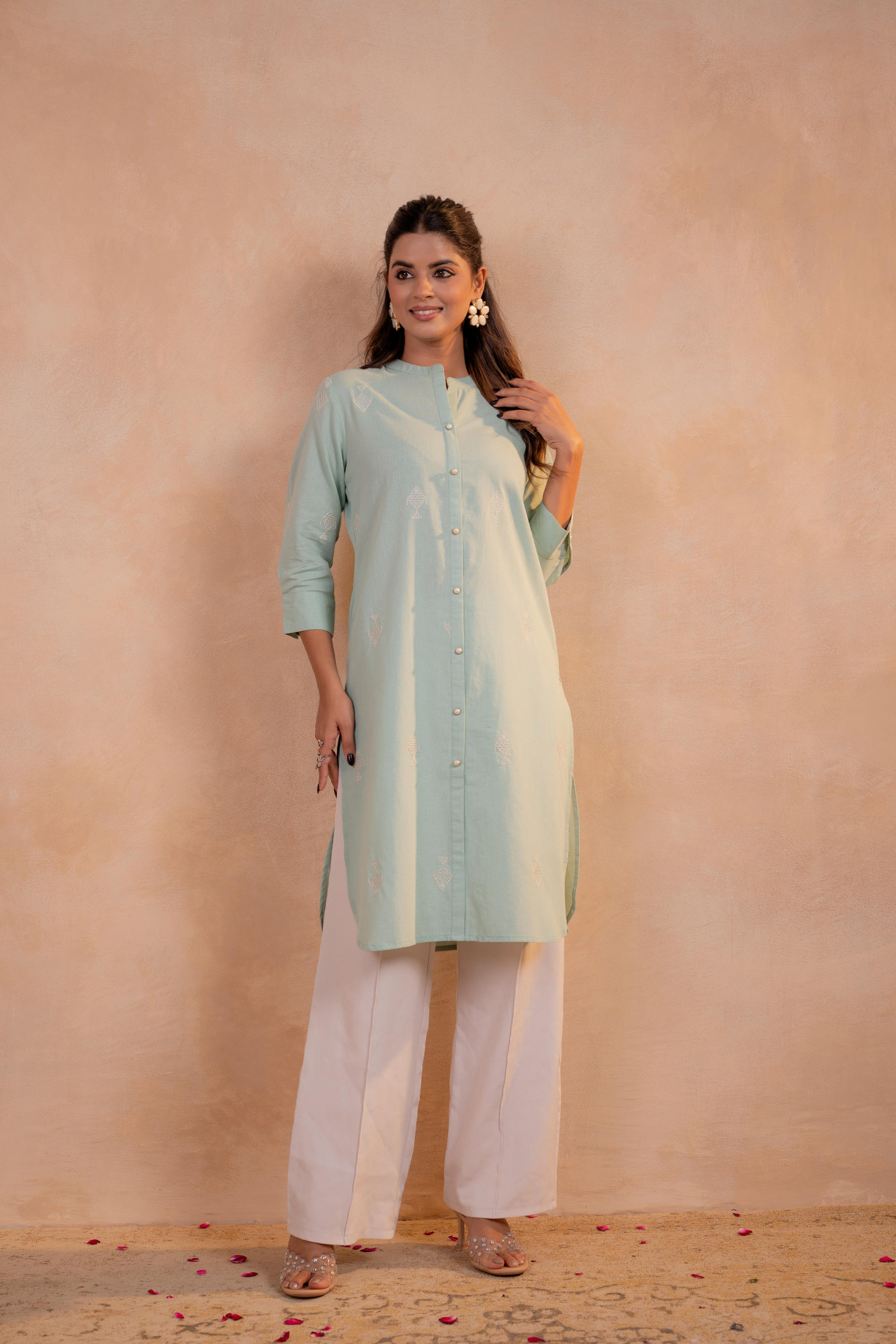 A timeless sage green kurta crafted in a clean straight silhouette, featuring subtle tonal motifs and a classic button-down front. Designed for effortless elegance, this kurta balances softness and structure—perfect for elevated everyday wear and calm festive moments.