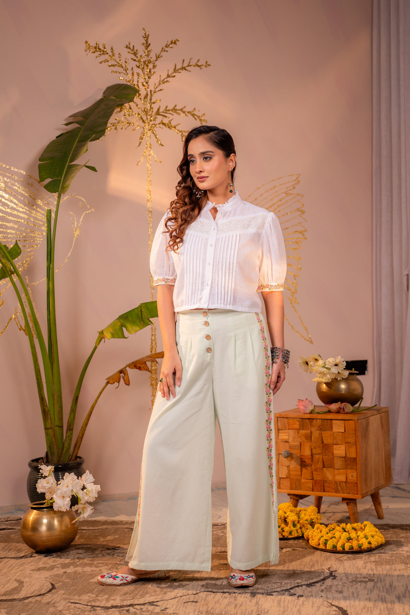 A refined pisstagreen co-ord set featuring a pintuck-detailed cotton top paired with wide-leg pants highlighted by delicate floral prints. Designed for effortless elegance, this ensemble blends subtle craftsmanship with contemporary comfort—ideal for warm-weather outings and refined daytime occasions.Top Type :- Tops Dupatta(Yes, No) :- No Top Pattern :- Printed Print Type :- Floral Top Fabric :- Cotton Top Design Styling :- Boxy Fit Crop Shirt Top Hemline :- Straight Top Length :- Waist length Top Shape :- Boxy Neck :- Mandarin ruffle collar Sleeve Length :- Elbow length Sleeve Styling :- Soft puff Bottom Type :- Pant Bottom Fabric :- Cotton Bottom Pattern :- Printed Ornamentation :- Buttons