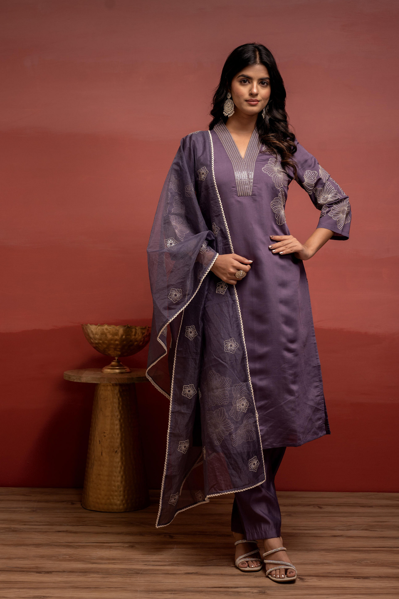 This festive plum viscose set features a straight calf-length kurta with V-neck, 3/4 regular sleeves, and side slit, paired with solid slip-on pants and matching dupatta. Enhanced with sequence and thread work, designed for a regular fit.Set Type Each Size :- 1 Kurta, 1 Pant, 1 Dupatta Top Pattern :- Embroidered Print Type :- Solid Top Fabric :- Viscose Top Design Styling :- Straight Top Length :- Calf Length Top Shape :- Straight Neck :- V-Neck Sleeve Length :- 3/4 Sleeve Top Closure :- Slip On Bottom Type :- Pants Bottom Fabric :- Viscose Bottom Pattern :- Solid Waistband :- Parsley Waistband Ornamentation :- Sequence, Thread Work Dupatta Fabric :- Viscose Dupatta Pattern :- Embroidered