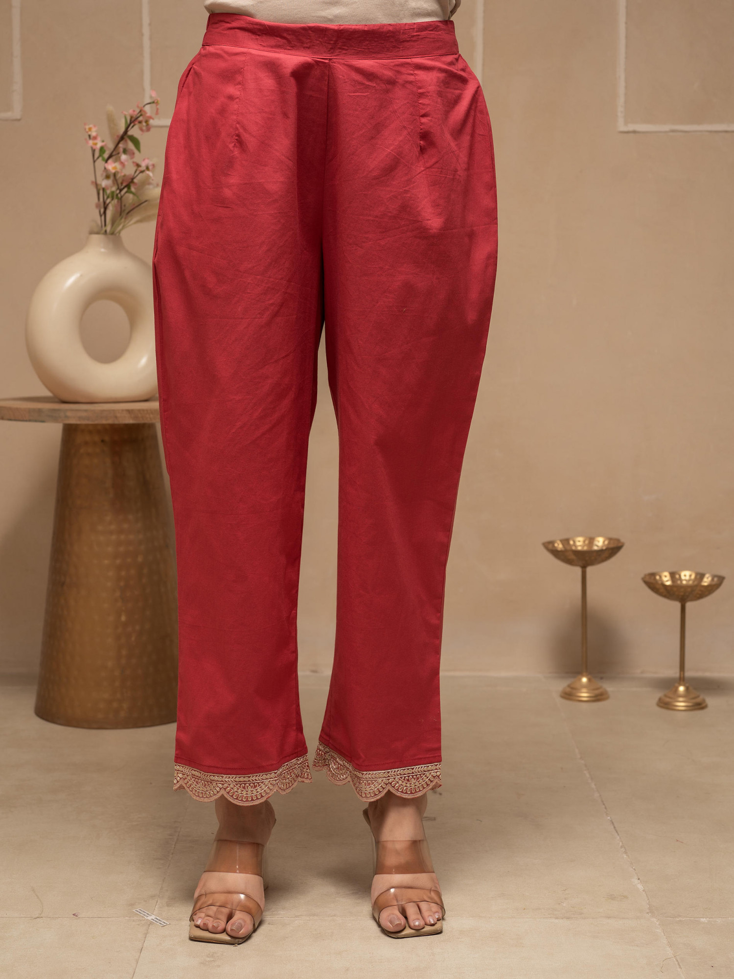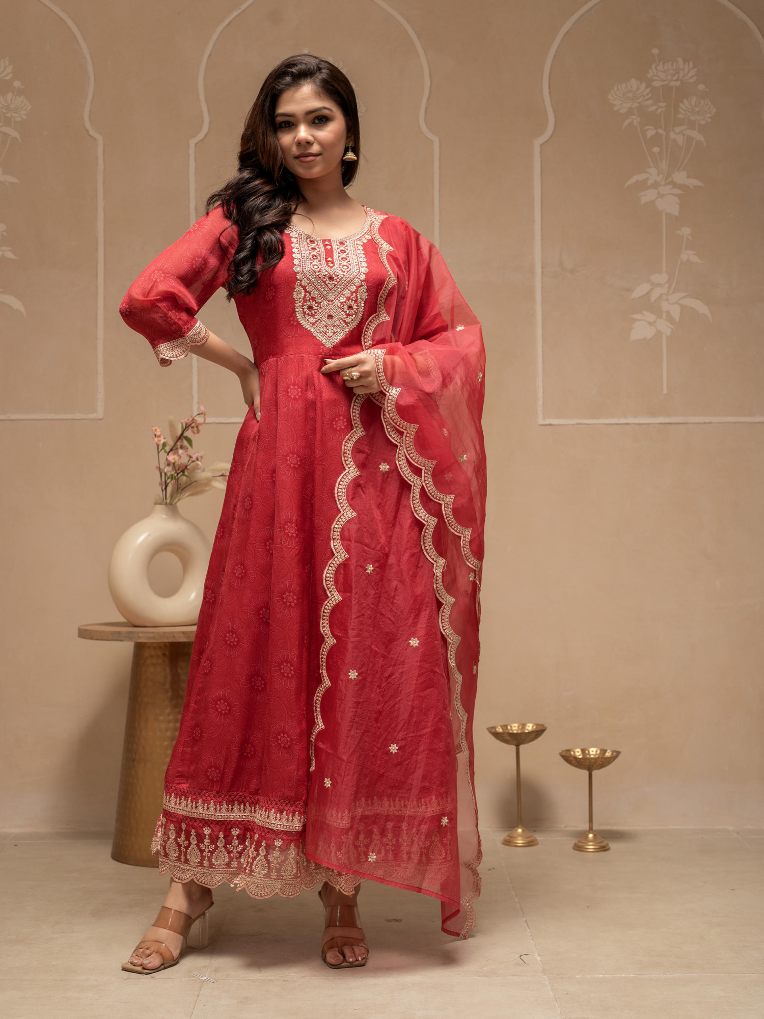 This festive red viscose set features a panelled, curved kurta with round neck and 3/4 regular sleeves, paired with solid slip-on pants and matching dupatta. Enhanced with mirror, thread work, and sequence details, designed for a regular fit.Set Type Each Size :- 1 Kurta, 1 Pant, 1 Dupatta Top Pattern :- Embroidered Print Type :- Floral Top Fabric :- Viscose Top Design Styling :- Panelled Top Length :- Ankle Length Top Shape :- Fit And Flared Neck :- Round Neck Sleeve Length :- 3/4 Sleeve Top Closure :- Slip On Bottom Type :- Pants Bottom Fabric :- Viscose Bottom Pattern :- Solid Waistband :- Parsley Waistband Ornamentation :- Mirror Work, Thread Work, Sequence Dupatta Fabric :- Viscose Dupatta Pattern :- Embroidered