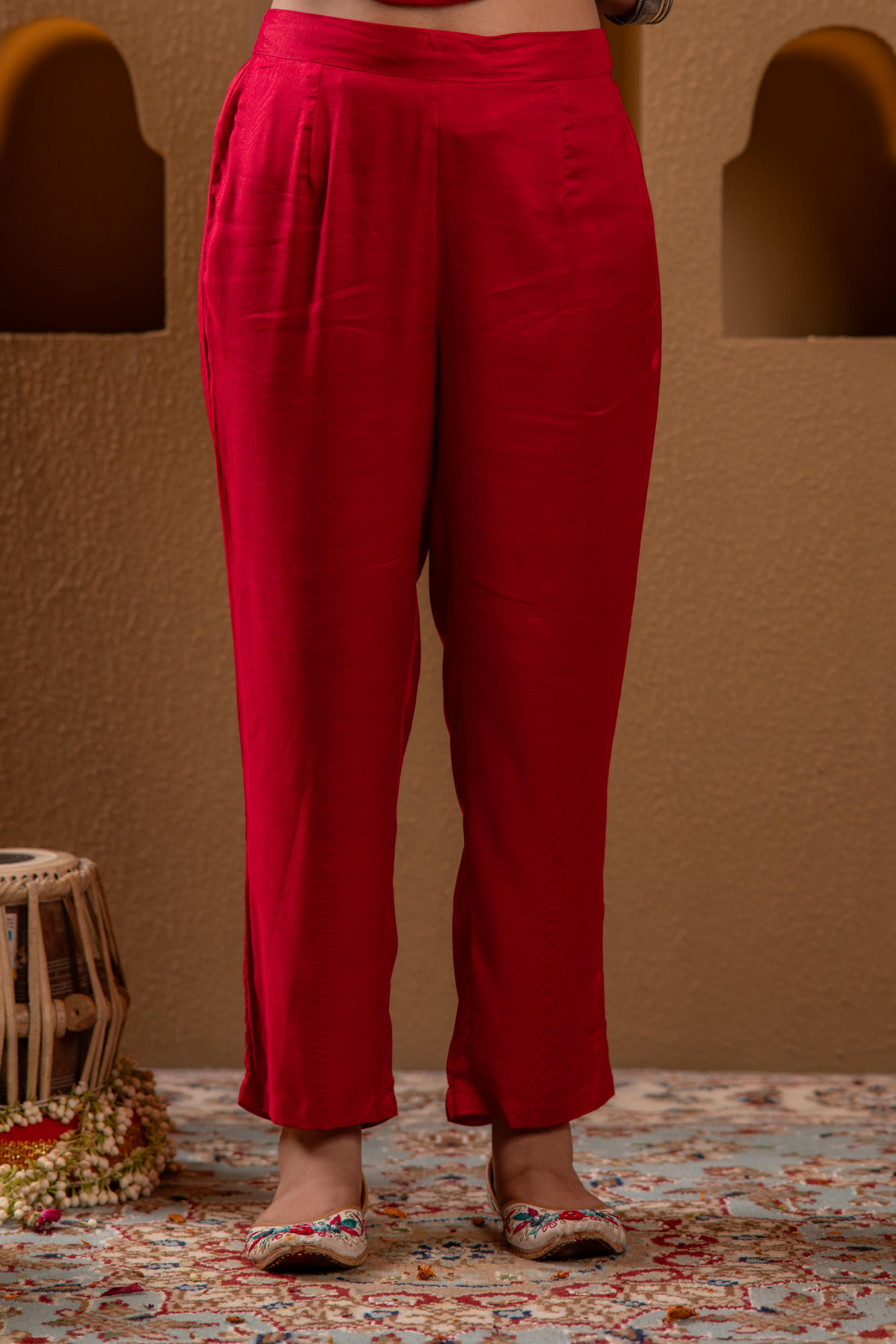 Stand out in festive elegance with this red straight-cut kurta set featuring intricate mirror, thread, dori, and sequin embroidery. Designed with a V-neck, side slits, and straight pants, this set blends traditional charm with contemporary grace.Each Size Pack of Content :- 1 Kurta, 1 Pant, 1 Dupatta Top Type :- Kurta Dupatta(Yes, No) :- Yes Top Pattern :- Embroidered Print Type :- Solid Top Fabric :- Manmade Fiber Top Design Styling :- Straight Top Hemline :- Straight Top Length :- Calf Length Top Shape :- Straight Neck :- V-Neck Sleeve Length :- 3/4 Sleeve Sleeve Styling :- Regular Sleeve Top Closure :- slip on Bottom Type :- Pant Bottom Fabric :- Viscose Bottom Pattern :- Solid Bottom Closure :- slip on Waistband :- partially elasticated Occasion :- festive Ornamentation :- Mirror Work, Thread Work, Dori, Sequence Dupatta Fabric :- Man Made Fiber Dupatta Pattern :- Solid Fit :- Regular Fit