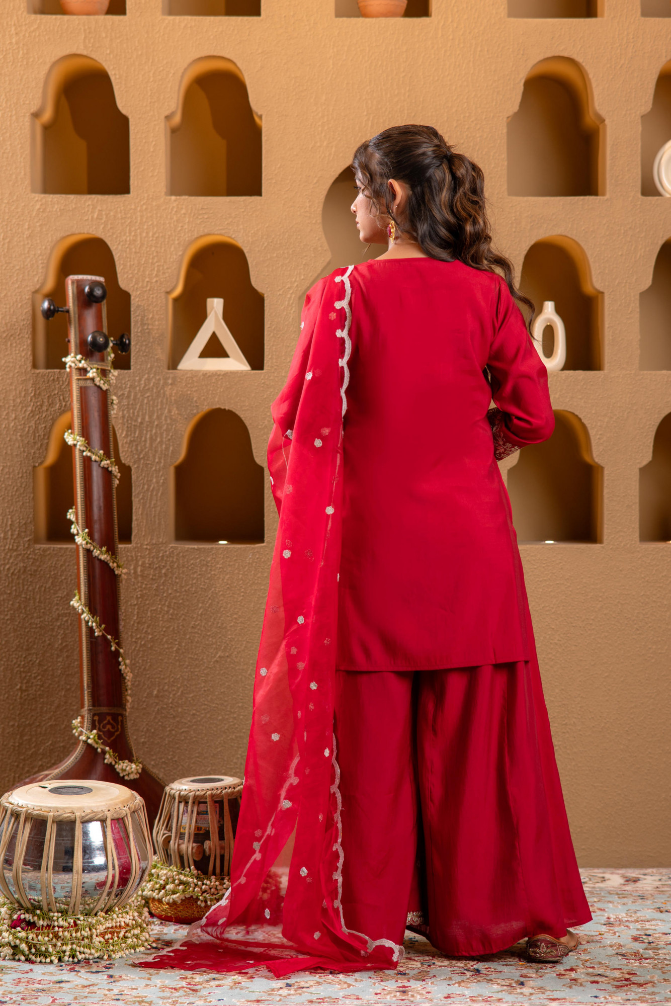 Red viscose flared kurta with a stylish sawal neck, calf-length and three-quarter sleeves. Embellished with mirror, thread, sequence, and zari embroidery. Paired with solid wide-leg palazzo pants and scalloped lace dupatta with floral motifs.Top Type :- Kurta Top Fabric :- Viscose Dupatta(Yes, No) :- Yes Top Pattern :- Embroidered Print Type :- Solid Top Design Styling :- Panelled Top Length :- Calf Length Top Shape :- A-Line Neck :- Sawal Neck Sleeve Length :- Three Quarter Sleeves Bottom Fabric :- Viscose Bottom Type :- Palazzo Ornamentation :- Mirror Work, Thread Work, Sequence, Zari Dupatta Fabric :- Manmade Fiber Dupatta Pattern :- Solid