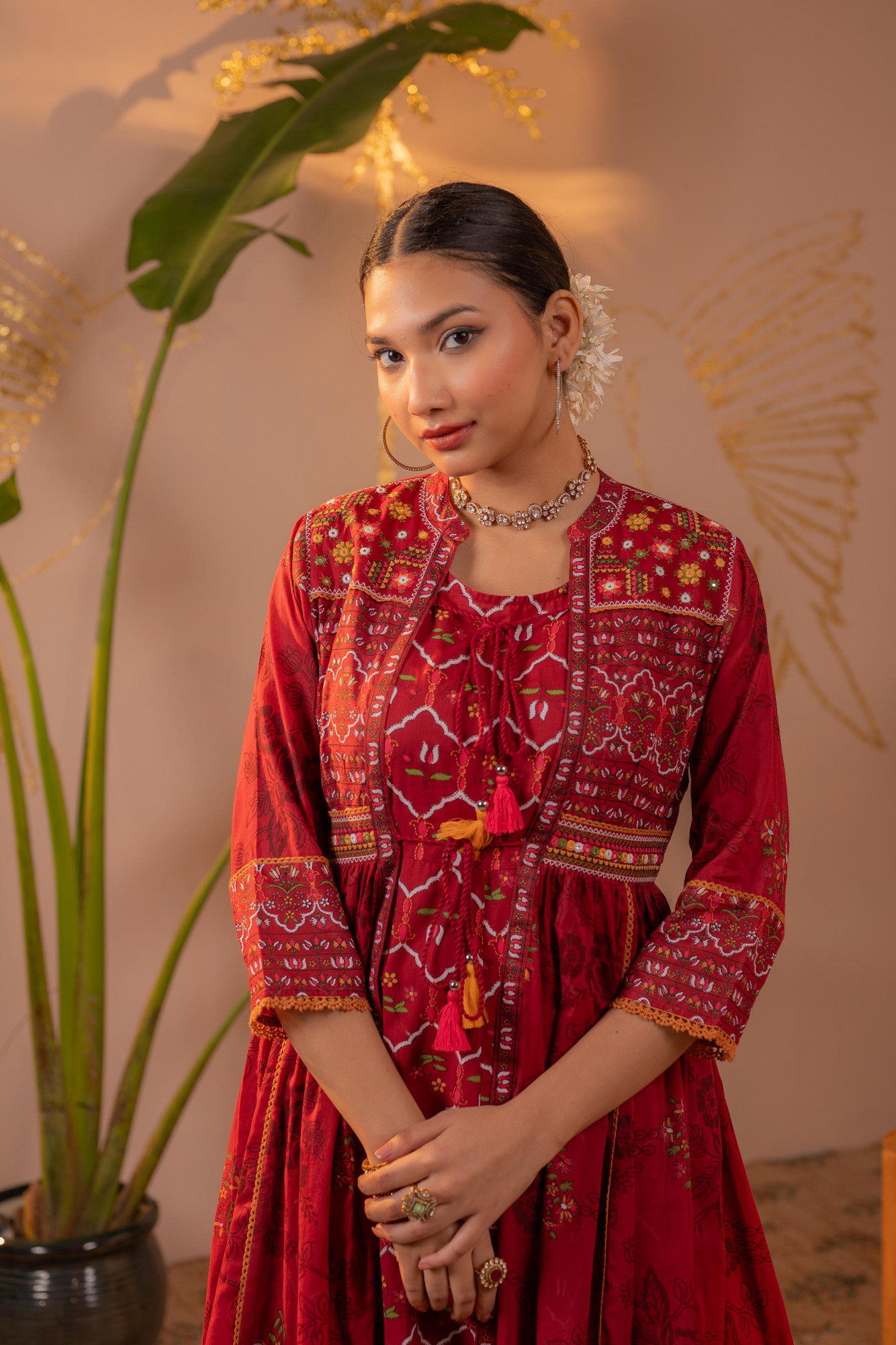 A rich and regal jacket-style long dress in maroon , featuring intricate traditional prints and detailed yoke . Designed with layered panels and a flowy Anarkali silhouette, this ensemble exudes festive grandeur while maintaining graceful movement and timeless ethnic charm.Pack of Content :- 1 LONGDRESS, 1 INNER Top Type :- Dress Top Pattern :- Printed Print Type :- Ajrakh Top Fabric :- Cotton Top Design Styling :- Jacket-style layered Anarkali LongDress Top Hemline :- Flared Top Length :- Ankle-length Top Shape :- A-Line Neck :- Round Sleeve Length :- Three-quarter sleeves Occasion :- Semi festive Ornamentation :- Threads,Dori,Tassels Fit :- Fit & Flare