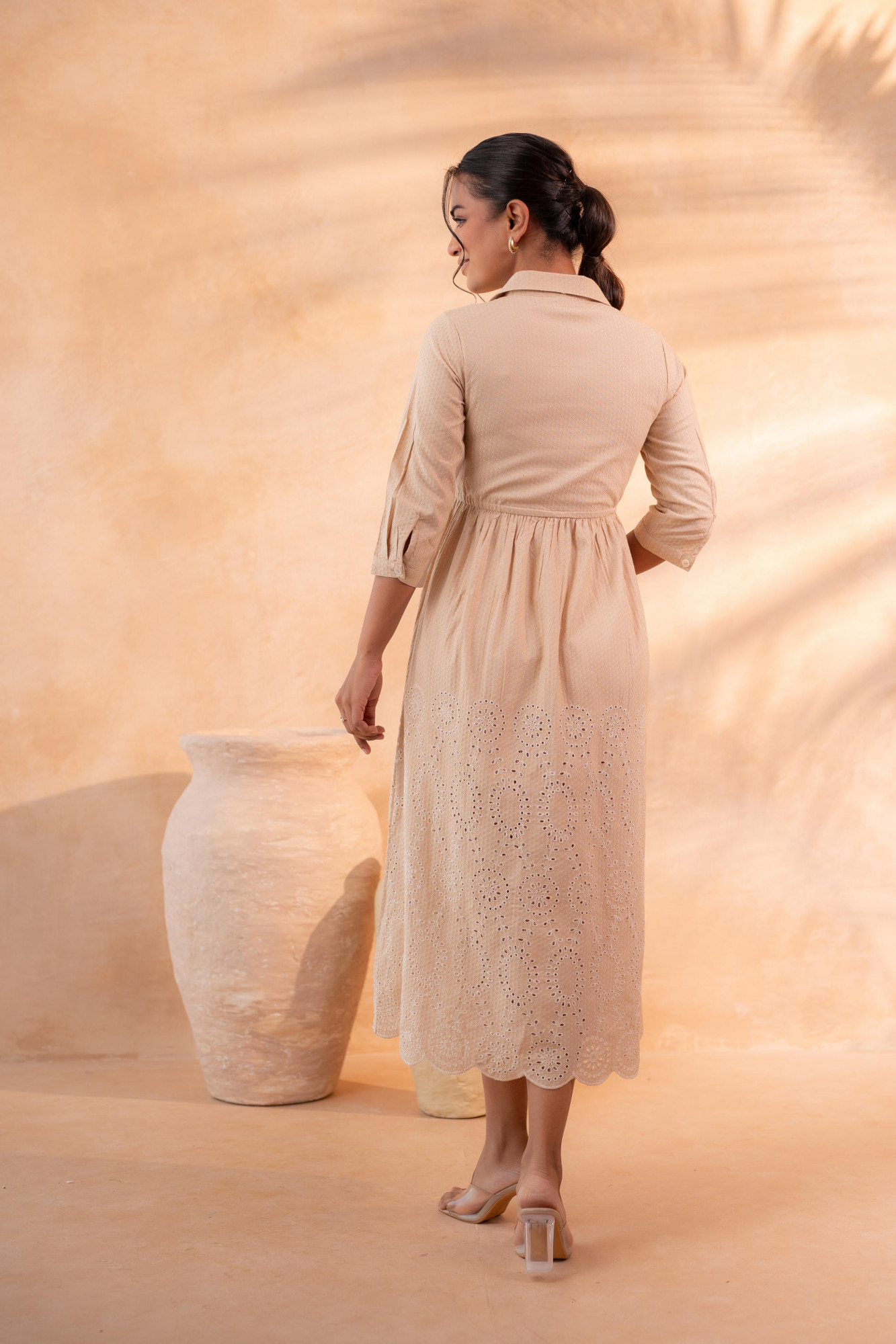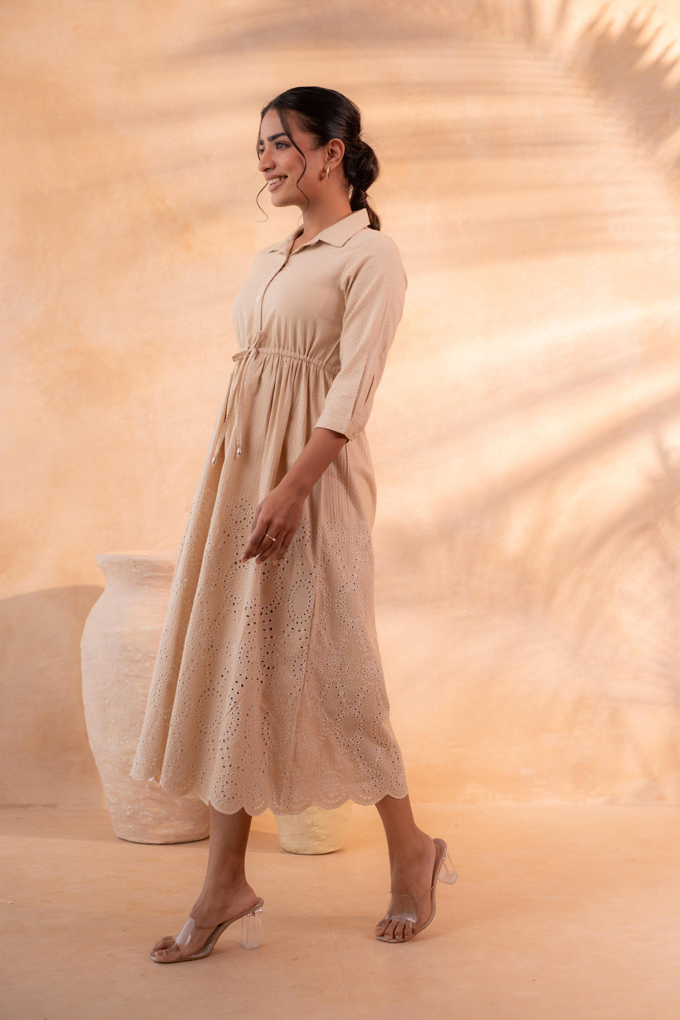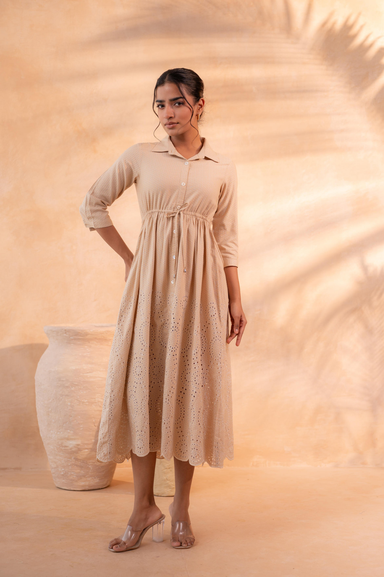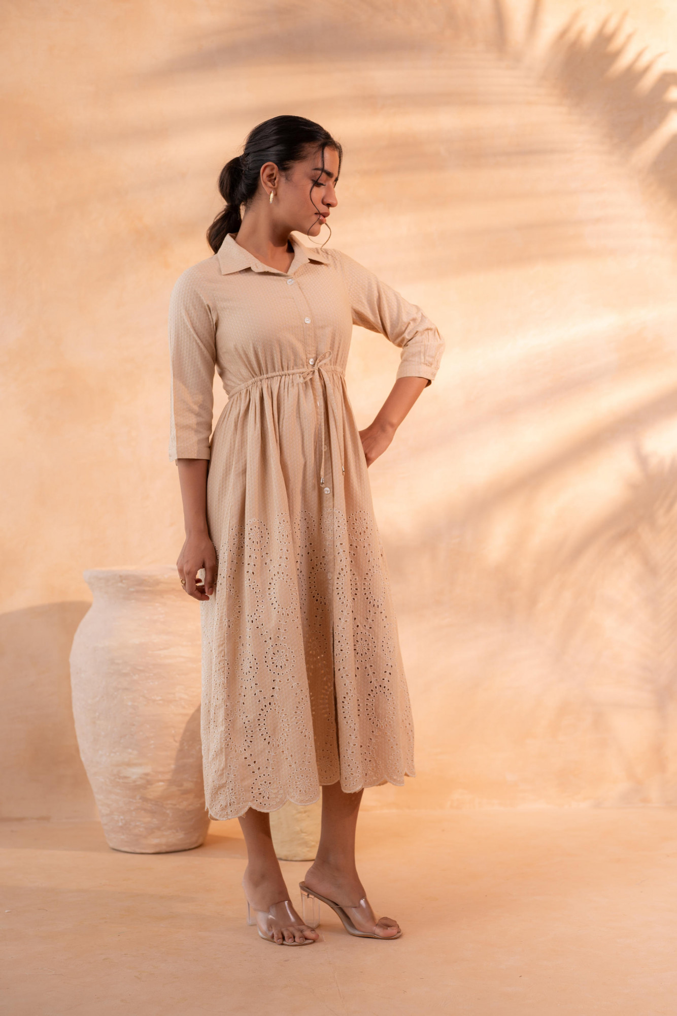 A refined warm camel long dress crafted in a soft, breathable fabric with delicate cutwork embroidery concentrated along the skirt. Designed with a classic shirt collar and full button-down front, the silhouette features a softly gathered waist with adjustable drawstring ties for a flattering shape. The scalloped hemline and airy flare create effortless movement, making it a perfect blend of comfort and understated sophistication.Pack of Content :- 1 LONGDRESSTop Type :- Dress Top Pattern :- Embroidered Print Type :- Schiffli Top Fabric :- Man Made Fiber Top Design Styling :- Shirt-style long dress Top Hemline :- Scalloped Top Length :- Calf length Top Shape :- A-line Neck :- Shirt collar Sleeve Length :- Three-quarter sleeves Top Closure :- Front button-down >Ornamentation :- Buttons,Belt