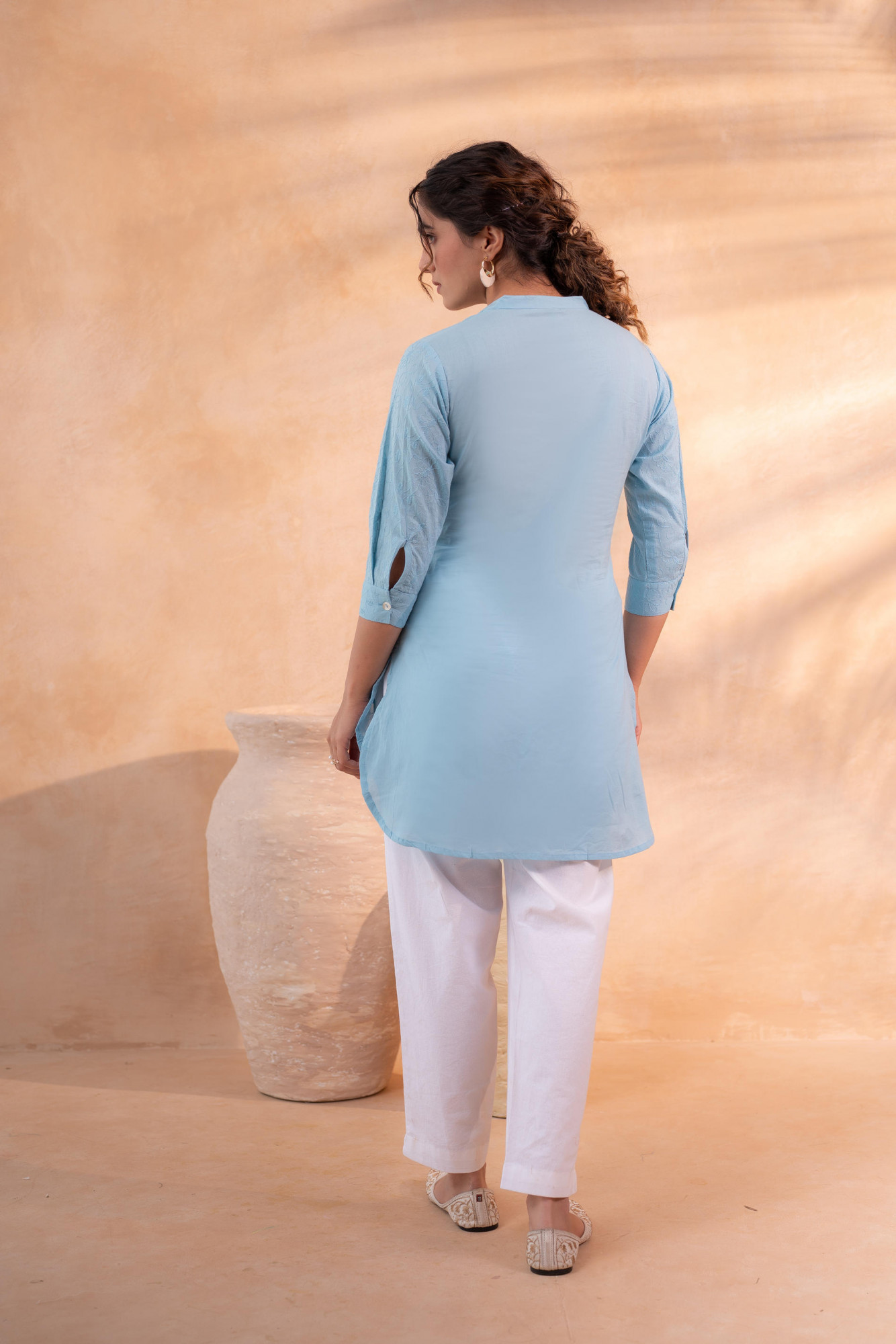 A timeless sky blue tunic crafted in breathable cotton fabric, featuring a clean silhouette and minimal detailing. Designed with a soft V-slit neckline and three-quarter sleeves, this tunic is perfect for effortless everyday elegance and versatile styling.Pack of Content Each Size Set:- 1 TUNIC Top Type :- Tunic Top Pattern :- Solid Top Fabric :- Cotton Top Design Styling :- Straight Short Kurta Top Hemline :- Straight Top Length :- Mid-thigh length Top Shape :- Straight Neck :- Round neck with V-notch Sleeve Length :- Three-quarter sleeves Sleeve Styling :- Regular Top Closure :- Slip-on Occasion :- Casual