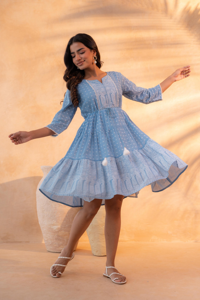 A breezy sky blue tiered dress crafted with delicate textured motifs and subtle vertical detailing. Designed with a softly gathered empire waist and this dress offers graceful movement and effortless charm. Finished with statement tassel accents and three-quarter sleeves, it’s a perfect blend of minimal elegance and summer-ready comfort.