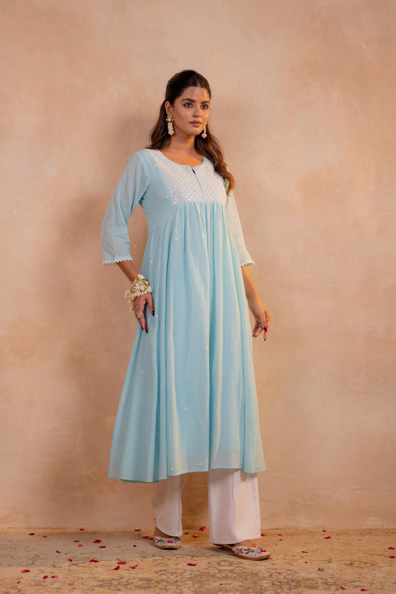 A soft and elegant noor kurta designed with a graceful flared silhouette and a delicately embellished yoke. The kurta radiates subtle festive charm through its minimal sequin detailing and airy flow, making it perfect for both everyday elegance and light festive occasions.Pack of Content :- 1 KURTA Top Type :- Kurta Top Pattern :- Embroidered Print Type :- Mirror Work Top Fabric :- Cotton Top Design Styling :- Anarkali Suit Top Hemline :- Flared Top Length :- Calf-length Top Shape :- A-Line Neck :- Round neck with slit Sleeve Length :- Three-quarter sleeves Occasion :- Semi festive Ornamentation :- Threads,Sequins Fit :- Fit & Flare