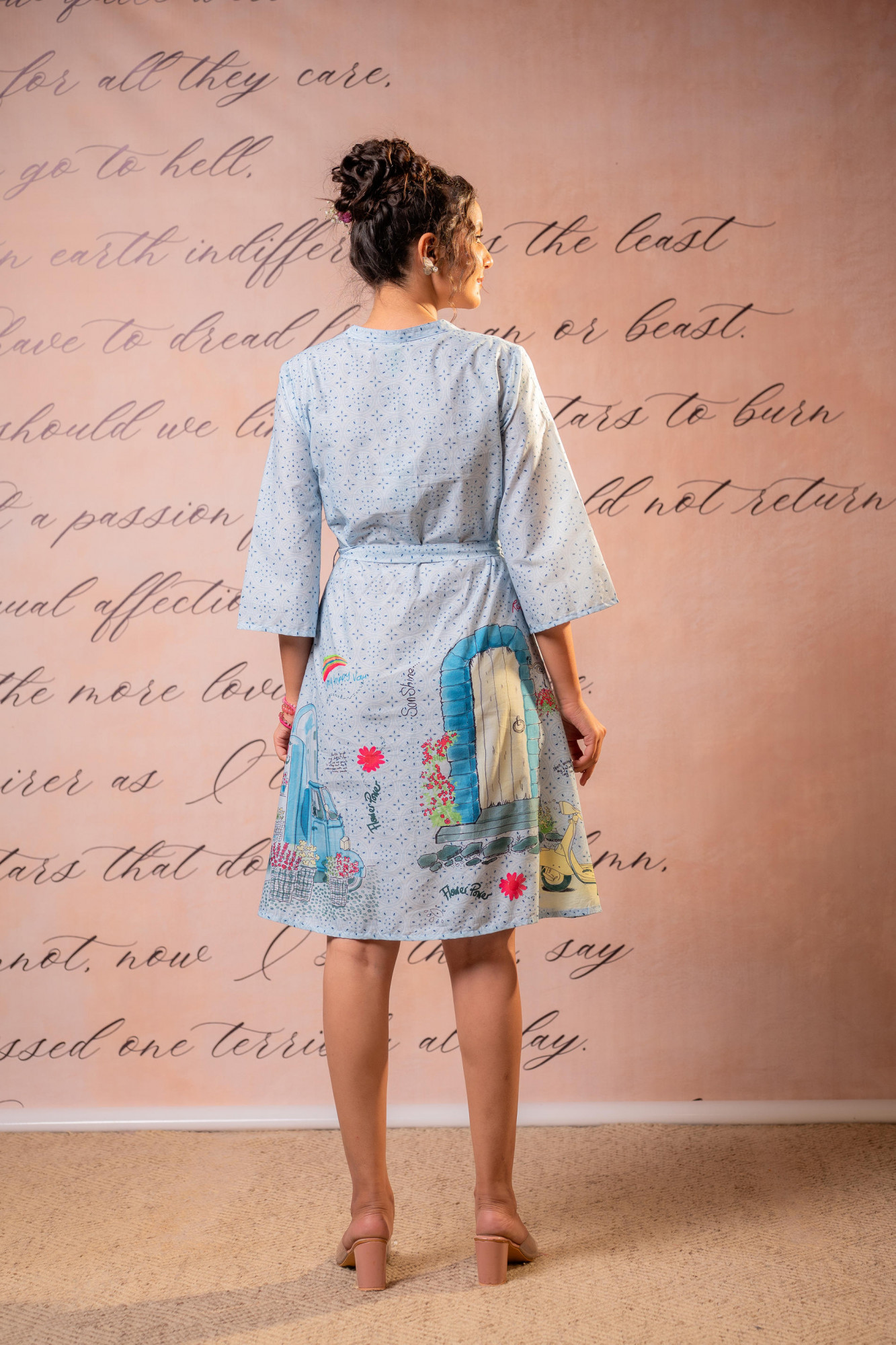 A playful yet sophisticated sky-blue shirt mini dress featuring delicate micro prints and artistic placement illustrations along the hem. Designed with a structured collar, front button placket, and adjustable waist tie, this piece blends contemporary tailoring with whimsical storytelling elements—perfect for creative daywear styling.Pack of Content :- 1 SHORTDRESS, 1 BELTTop Type :- Dress Top Pattern :- Printed Print Type :- Scenic Top Fabric :- Cotton Top Design Styling :- Straight shirt-style mini dress Top Hemline :- Curved Top Length :- Above Knee Top Shape :- A-line Neck :- Mandarincollar Sleeve Length :- Three-quarter sleeves Top Closure :- Front button-down >Ornamentation :- Buttons,Belt