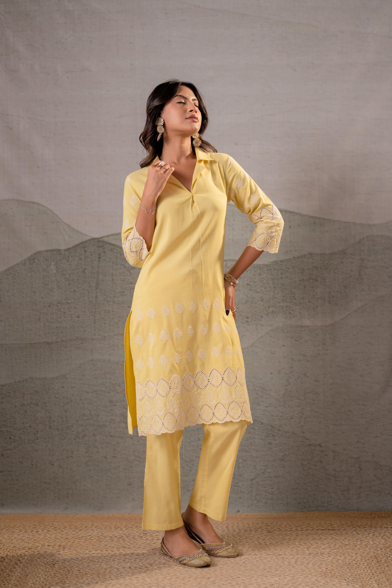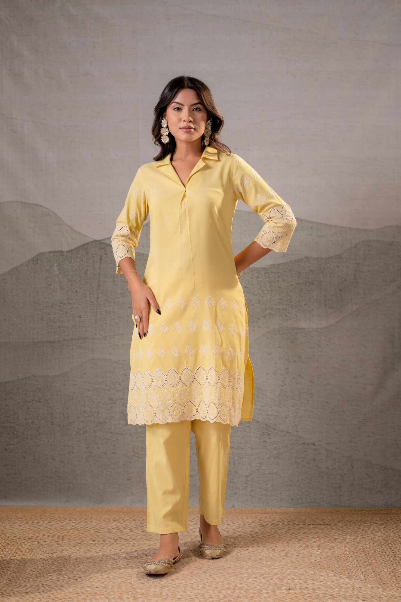 A cheerful butter yellow kurta set designed with delicate white schiffli embroidery along the hem and sleeves. The relaxed straight silhouette is enhanced with a soft shirt-style collar and minimal placket detailing. Paired with coordinated straight pants, this ensemble offers effortless charm — perfect for warm-weather elegance and light festive gatherings.