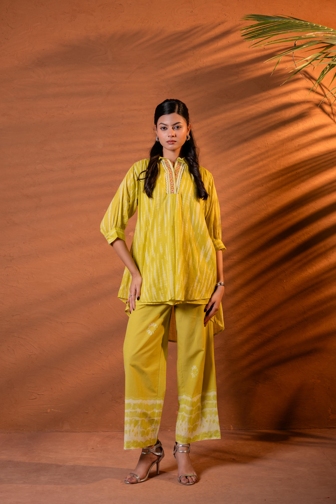 A fluid lime-toned tunic set crafted with vertical resist-inspired prints and subtle embroidered detailing at the neckline. Paired with relaxed printed pants, this ensemble reflects a perfect balance of handcrafted charm and contemporary comfort, ideal for effortless everyday elegance.Top Type :- Tunic Dupatta(Yes, No) :- No Top Pattern :- Printed Print Type :- Shibori Top Fabric :- Cotton Top Design Styling :- A-Line Short Kurta Top Hemline :- High–low Top Length :- Hip to mid-thigh length Top Shape :- A-Line Neck :- Shirt collar Sleeve Length :- Three-quarter sleeves Sleeve Styling :- Soft puff Bottom Type :- Pant Bottom Fabric :- Cotton Bottom Pattern :- Printed Ornamentation :- Threads, Lace